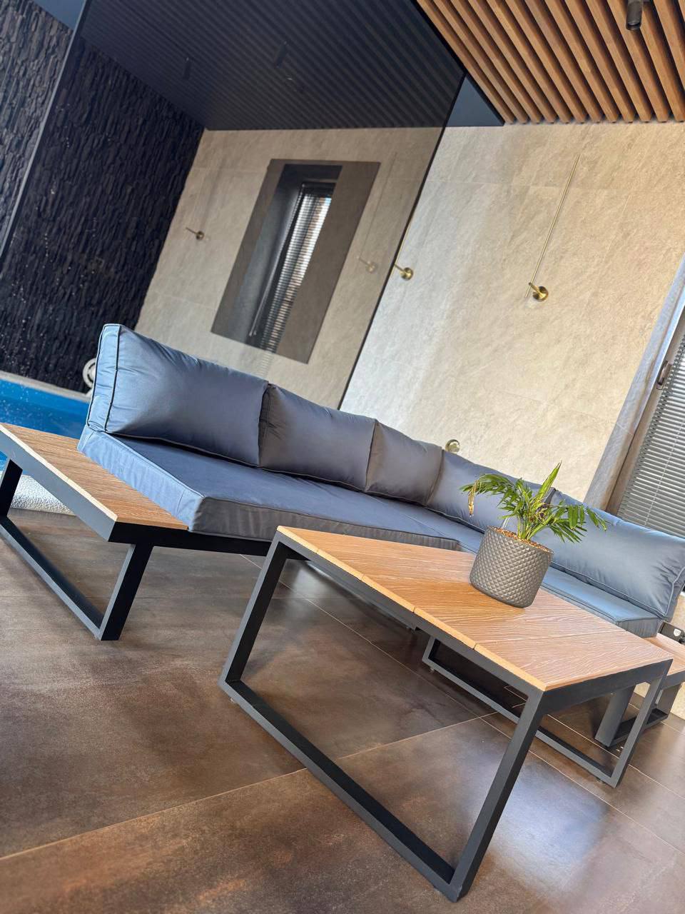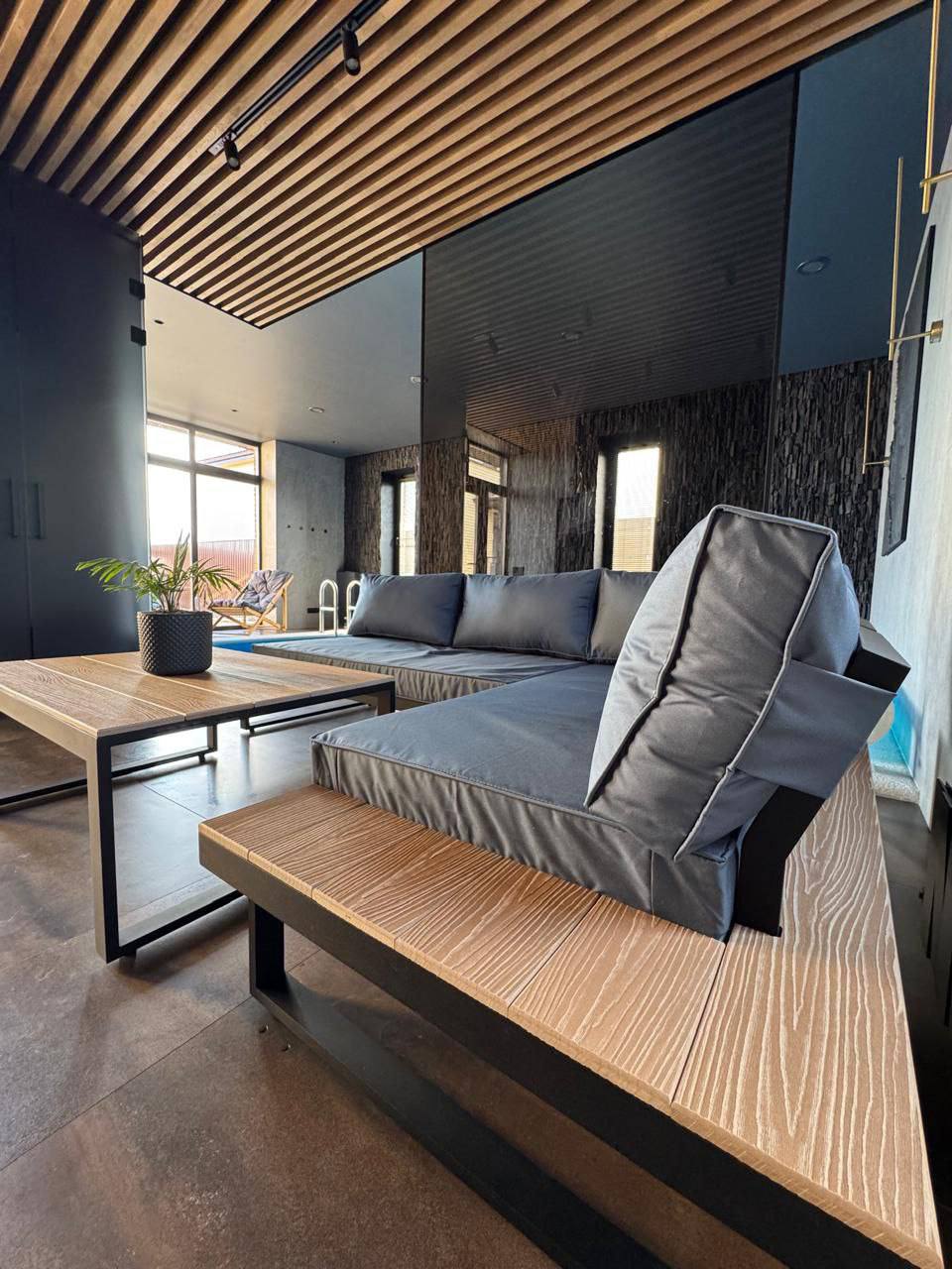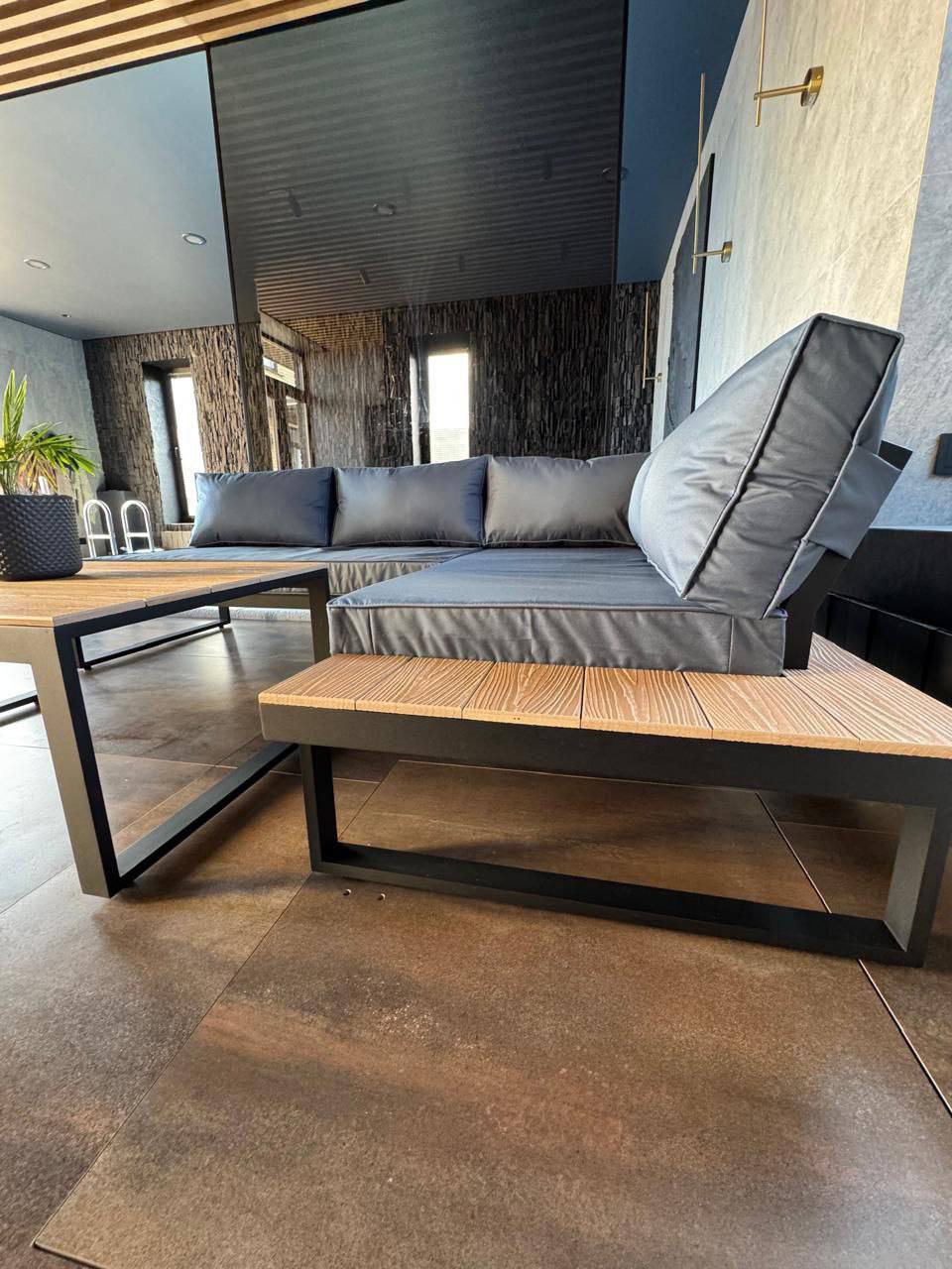 Металлический каркас с деревянными полками, мягкие съемные подушки и низкий стол. Подходит для общих зон отдыха.
