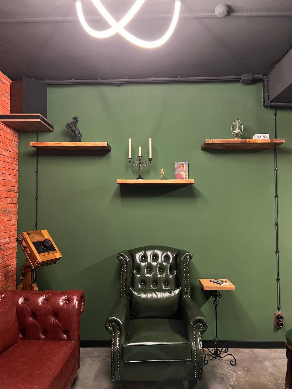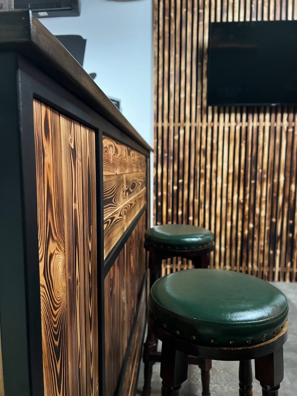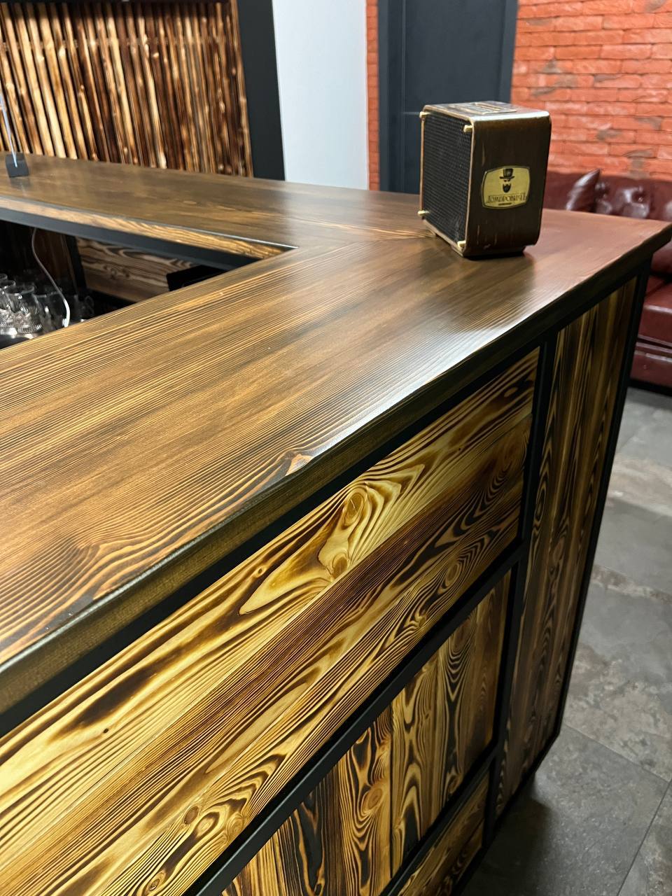 Металлический каркас с обжиговой доской, столешница и открытые полки. Интерьерное решение для барбершопов.