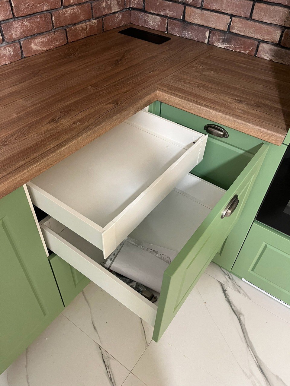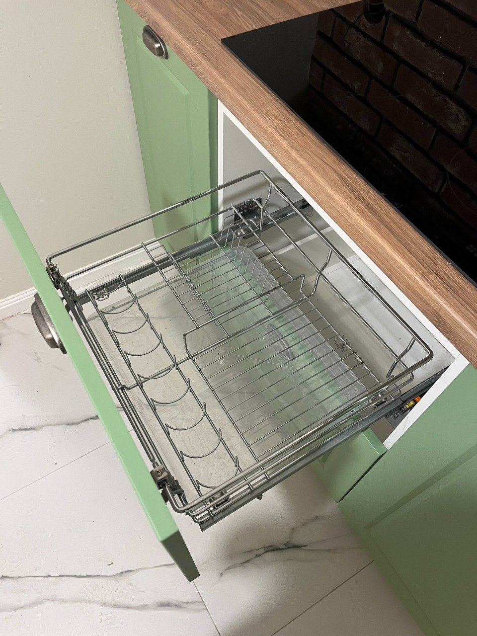 Каркас выполнен из металла, отделка подбирается под интерьер. Соберем конфигурацию под помещение и подберем фасады, фурнитуру и столешницу.
