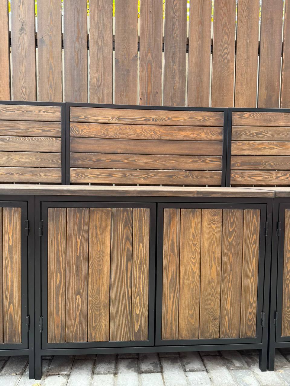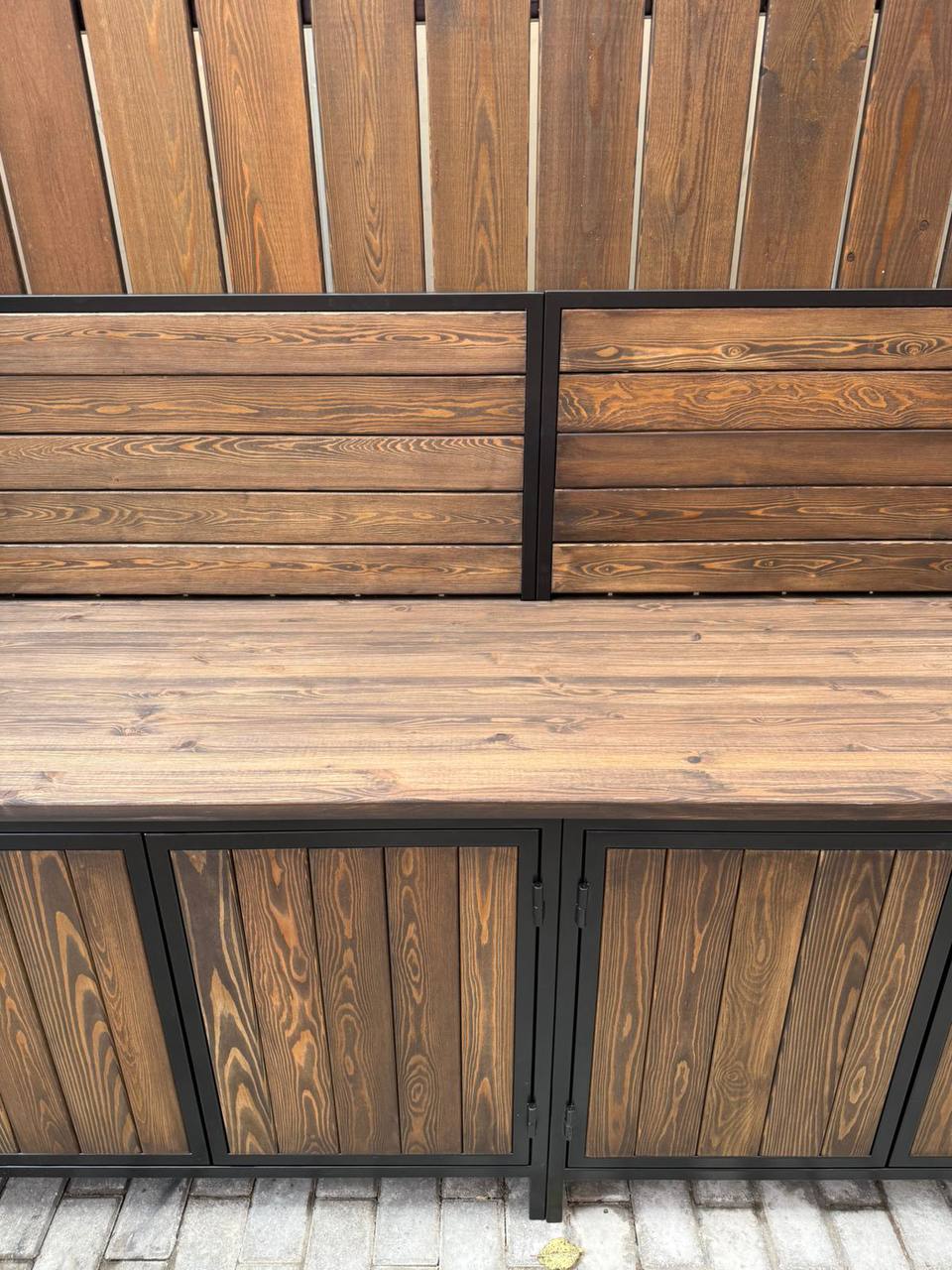 Каркас выполнен из стального профиля, окраска — порошковая для уличной эксплуатации. Соберем конфигурацию под помещение и подберем фасады, фурнитуру и столешницу.