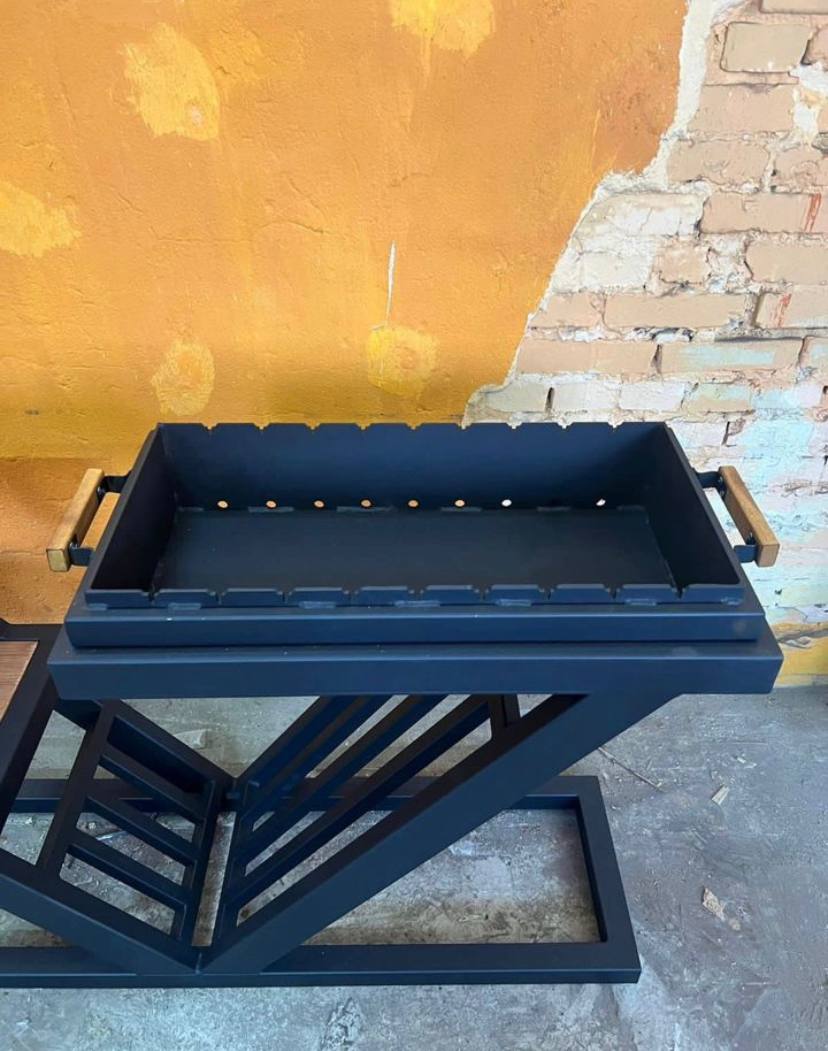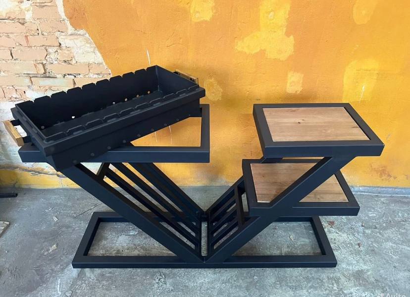 Каркас выполнен из стального профиля, окраска — порошковая для уличной эксплуатации. Деревянные элементы тонируются и защищаются под условия эксплуатации.