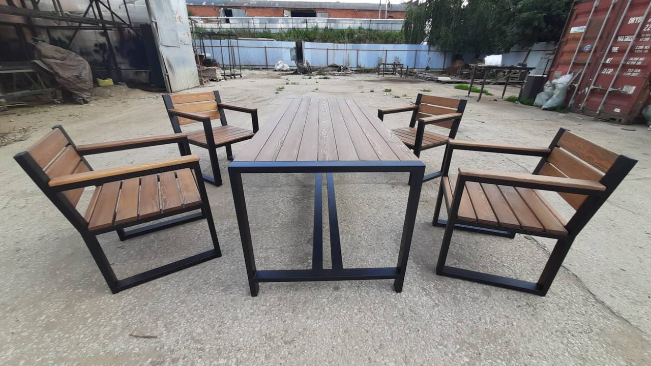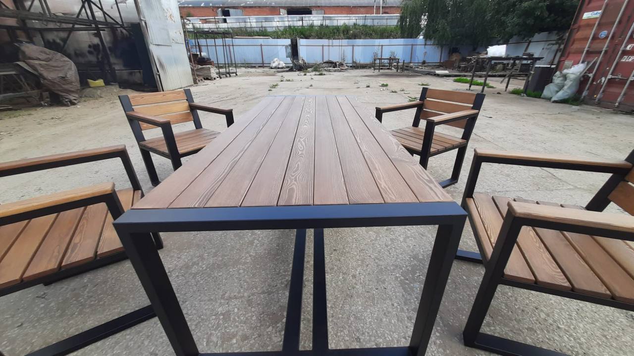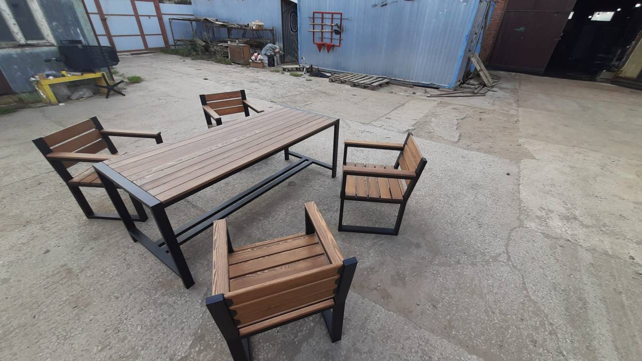 Каркас выполнен из стального профиля, окраска — порошковая для уличной эксплуатации. Деревянные элементы тонируются и защищаются под условия эксплуатации.