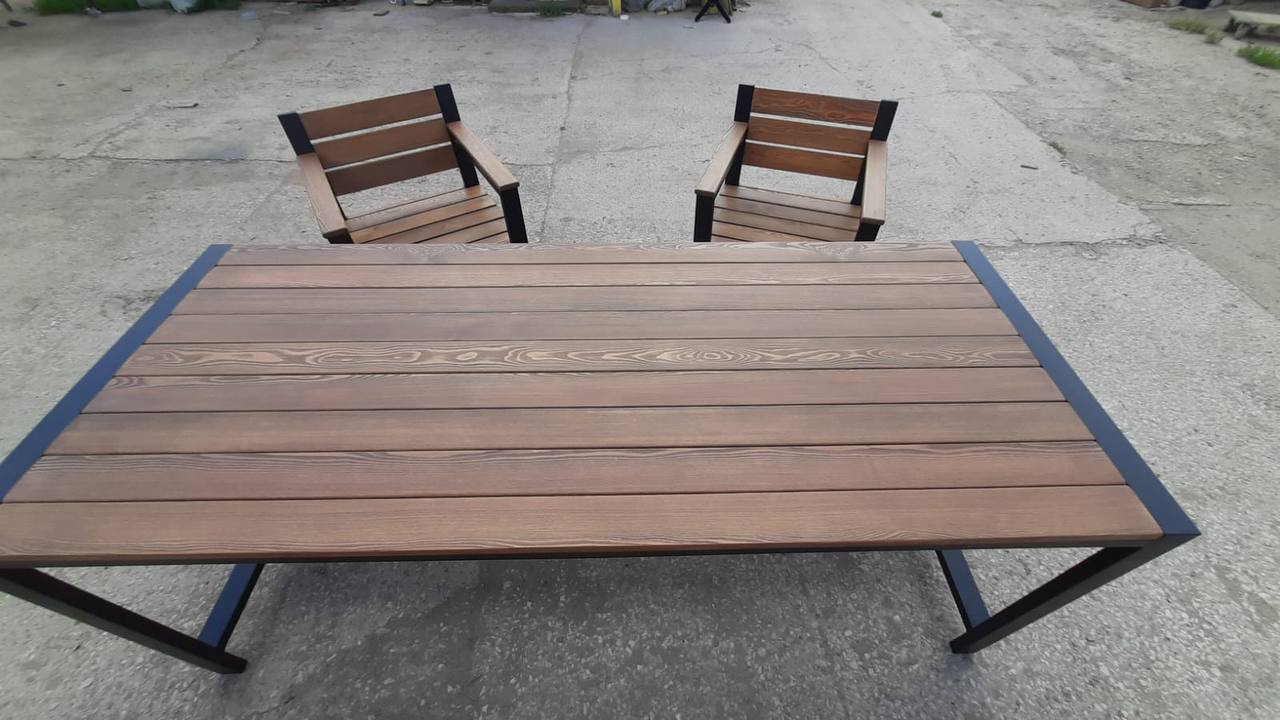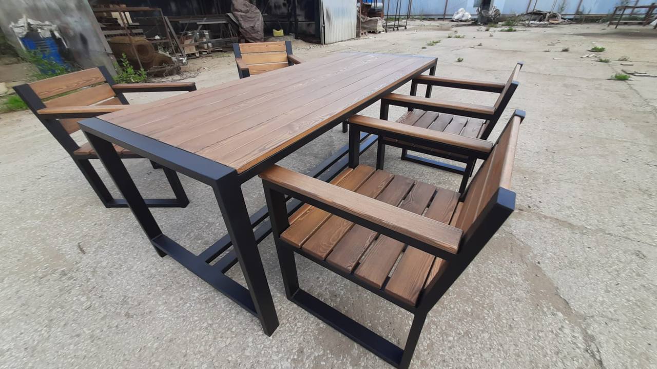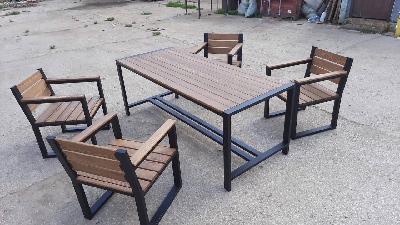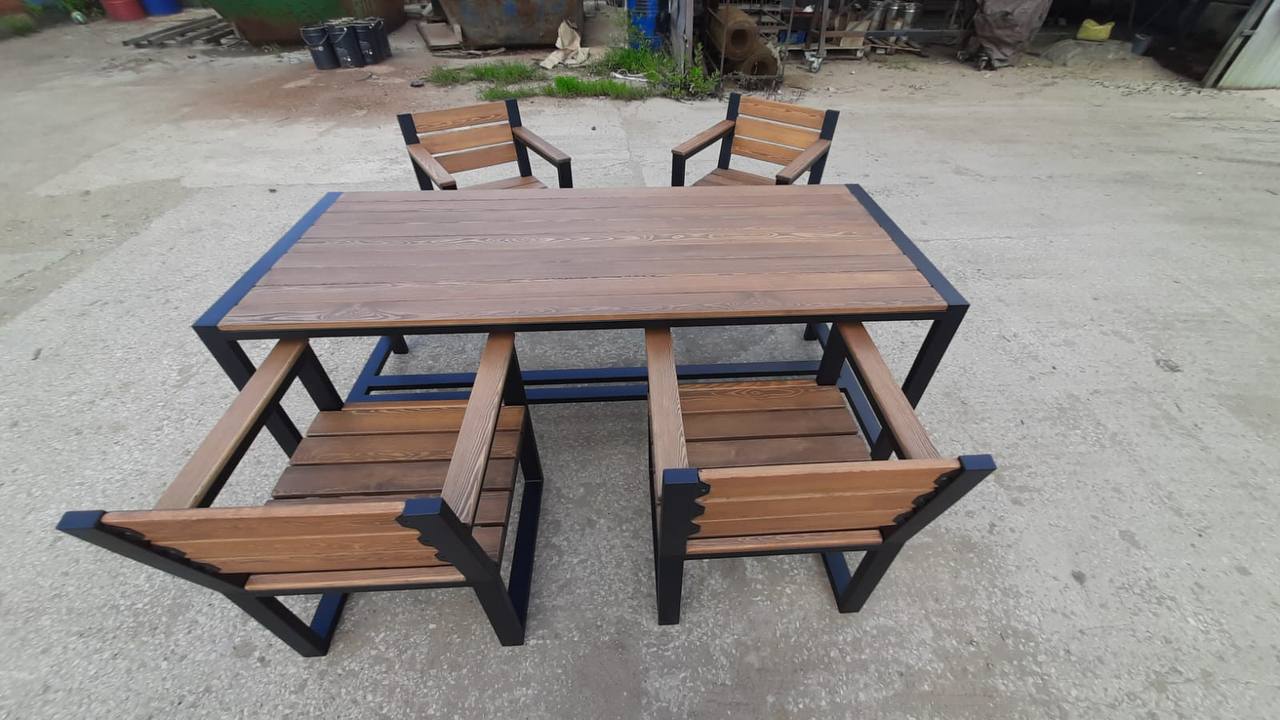 Каркас выполнен из стального профиля, окраска — порошковая для уличной эксплуатации. Деревянные элементы тонируются и защищаются под условия эксплуатации.