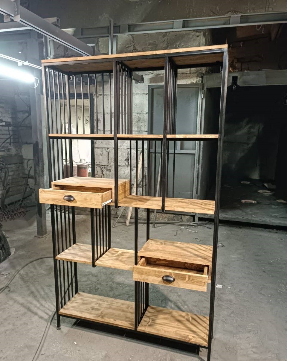 Каркас выполнен из металла, отделка подбирается под интерьер. Возможны варианты фасадов, внутреннего наполнения и подсветки.