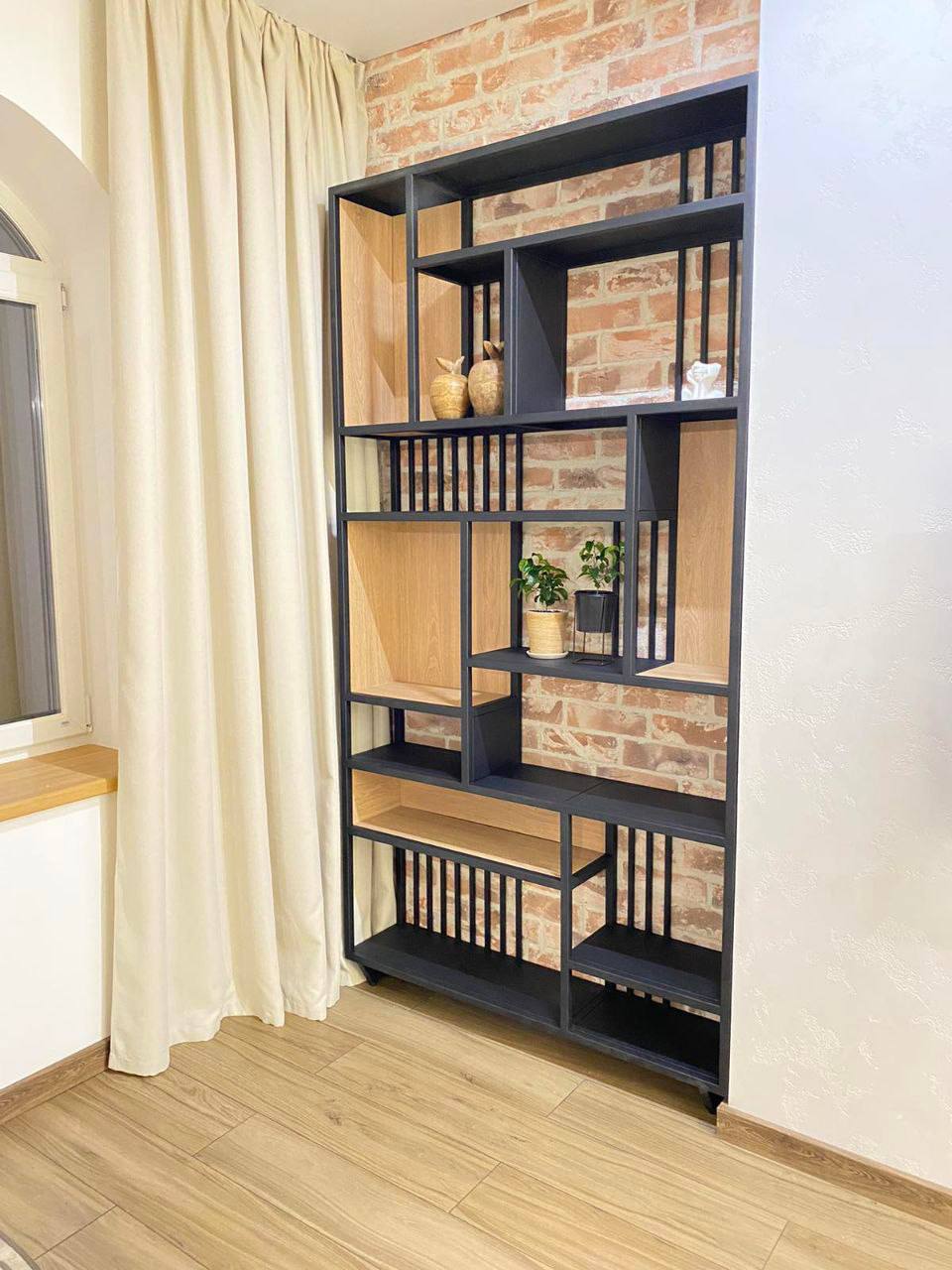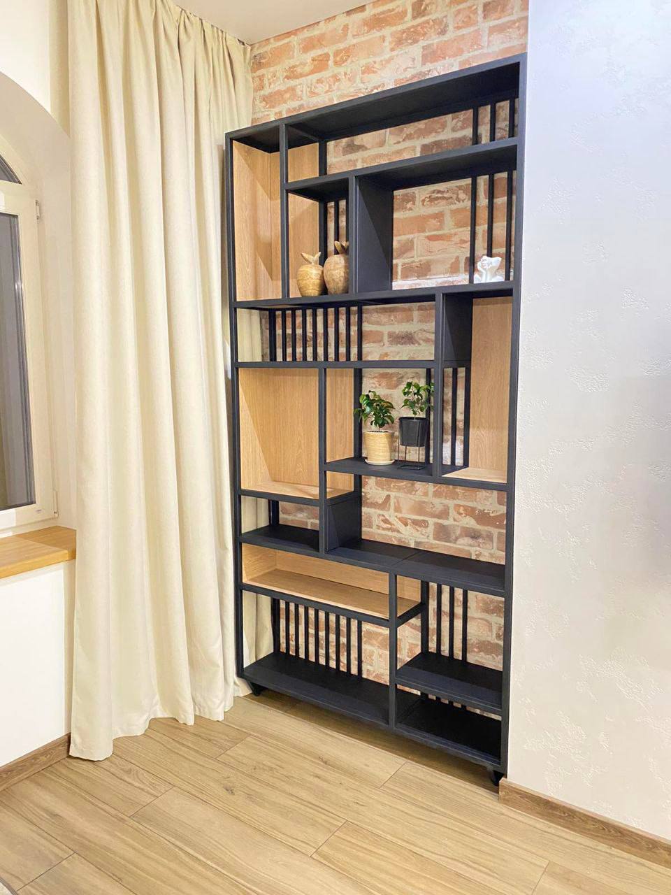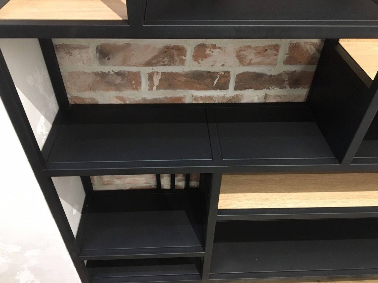 Каркас выполнен из металла, отделка подбирается под интерьер. Возможны варианты фасадов, внутреннего наполнения и подсветки.