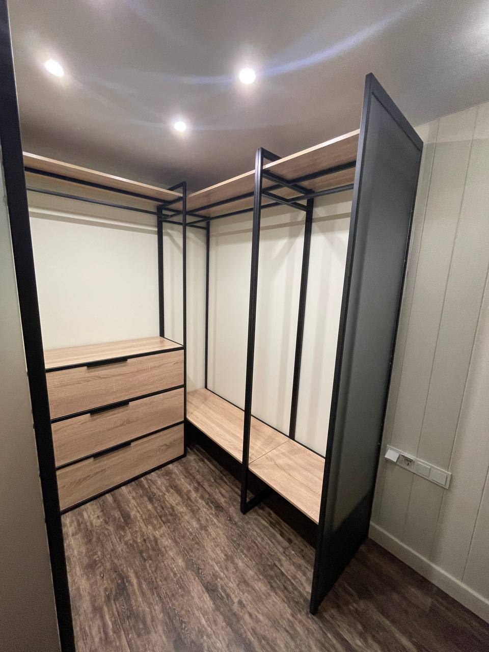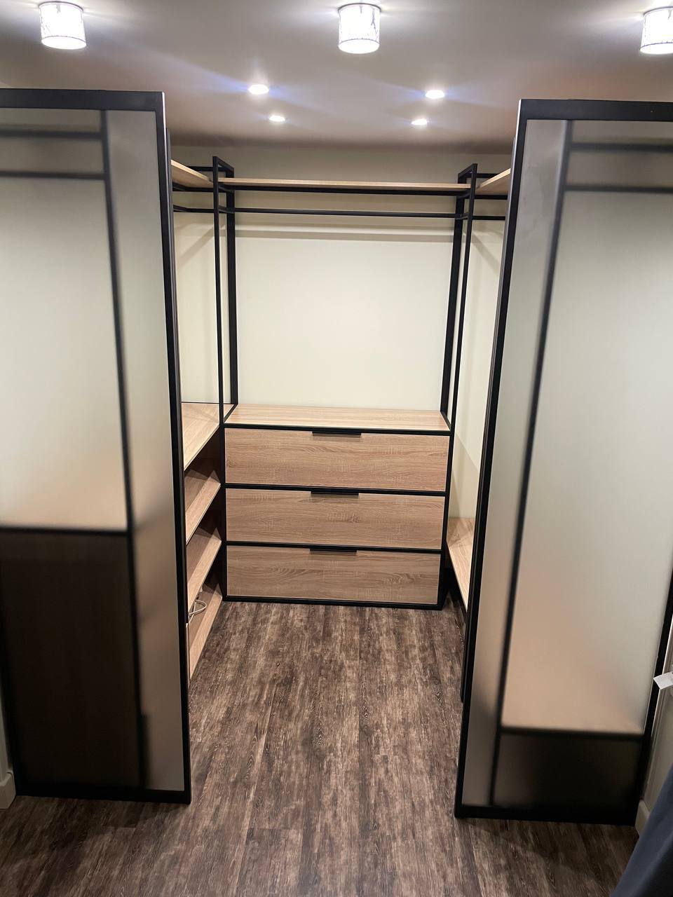 Каркас выполнен из металла, отделка подбирается под интерьер. Возможны варианты фасадов, внутреннего наполнения и подсветки.