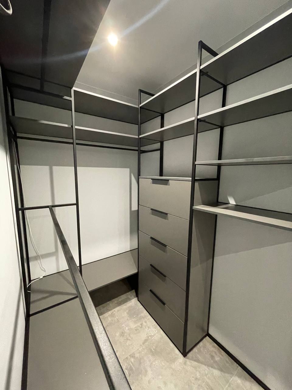 Каркас из металла, полки и стойки для одежды, модуль с ящиками. Подходит для гардеробных комнат и ниш.