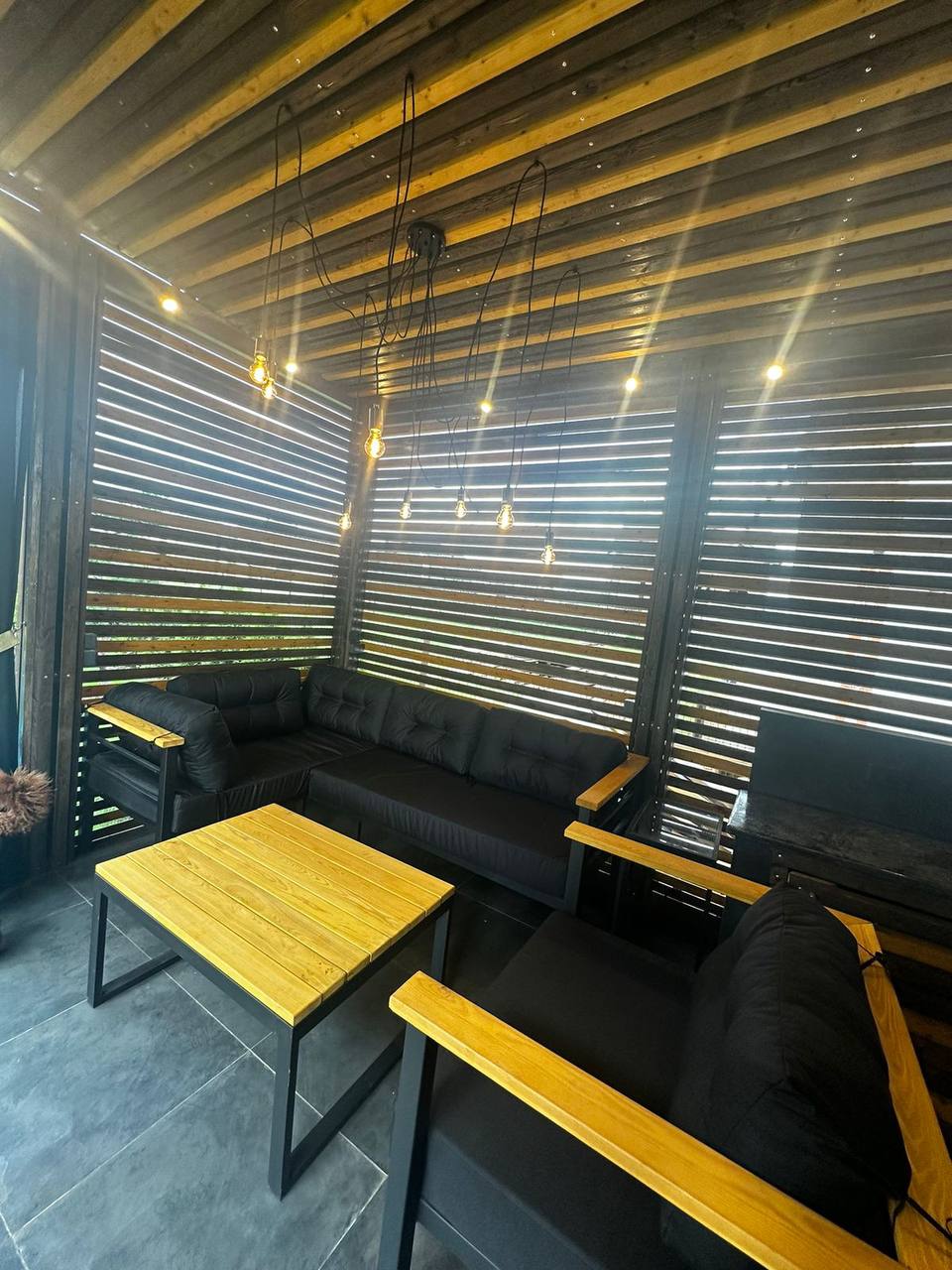 Каркас выполнен из стального профиля, окраска — порошковая для уличной эксплуатации. Размеры и комплектацию согласуем под вашу террасу или участок.