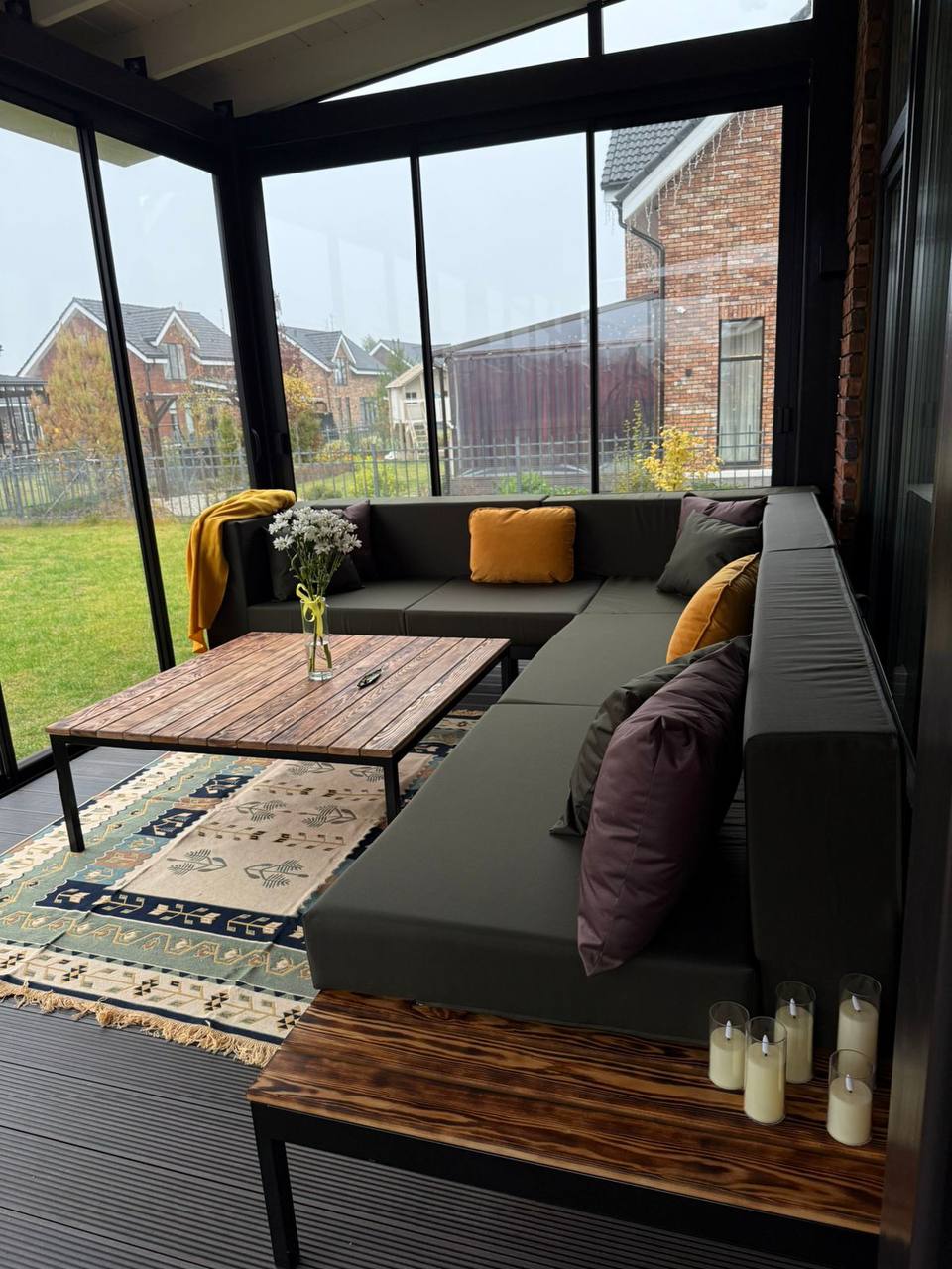 Лаунж-зона в закрытой террасе (контрастные подушки)