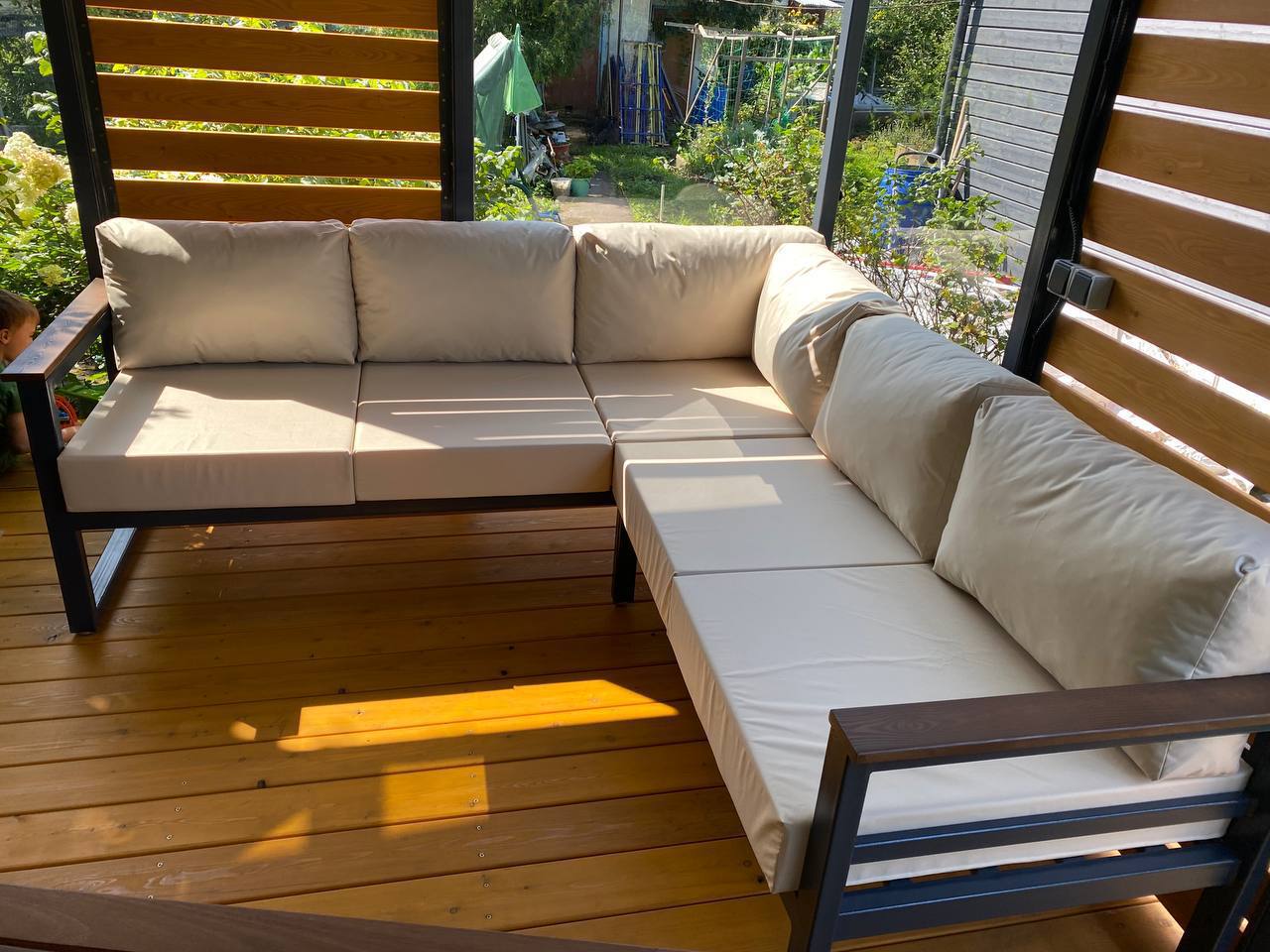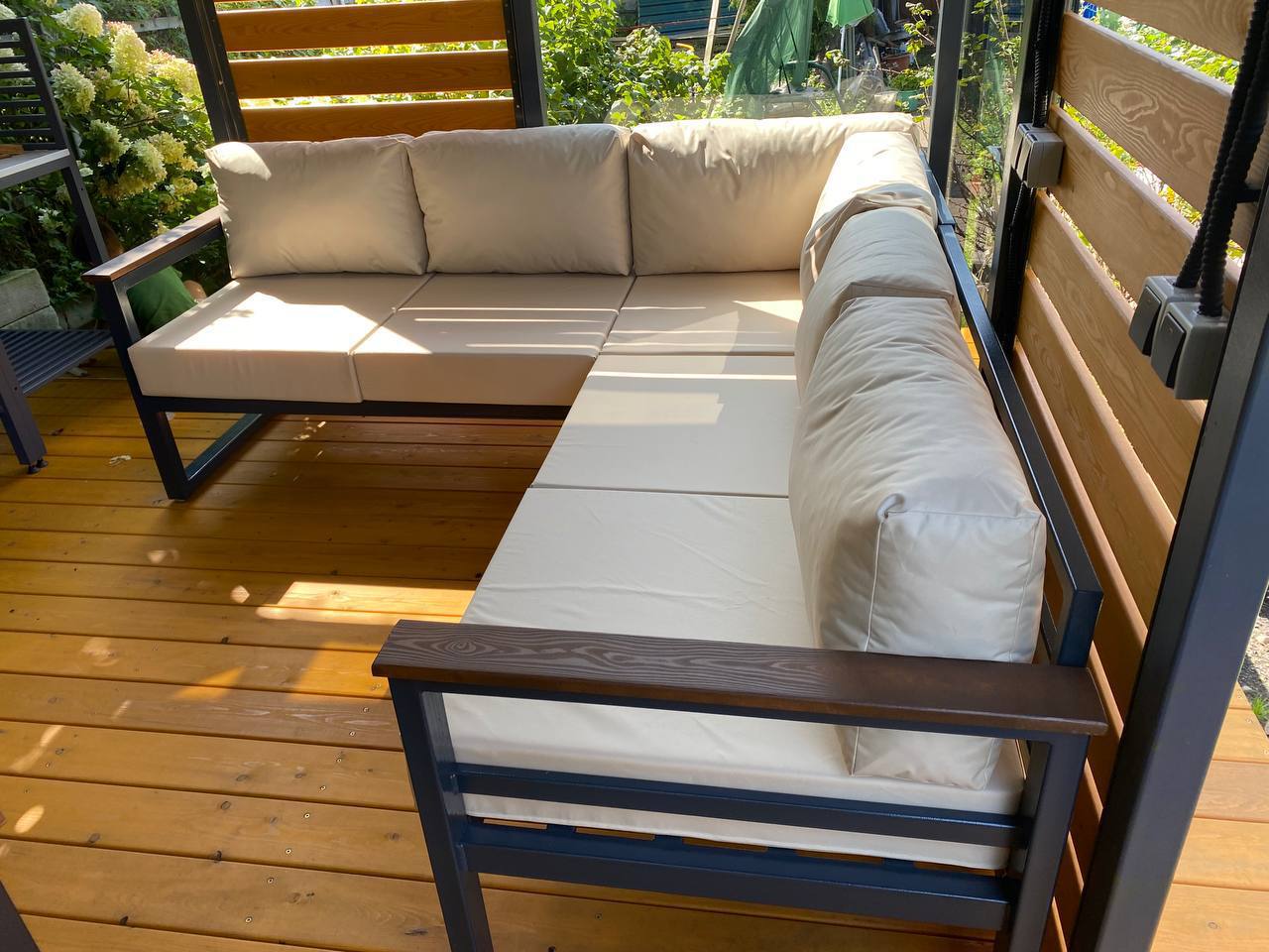 Металлический каркас с деревянными подлокотниками, глубокая посадка и мягкие съемные подушки. Подходит для беседок и веранд.