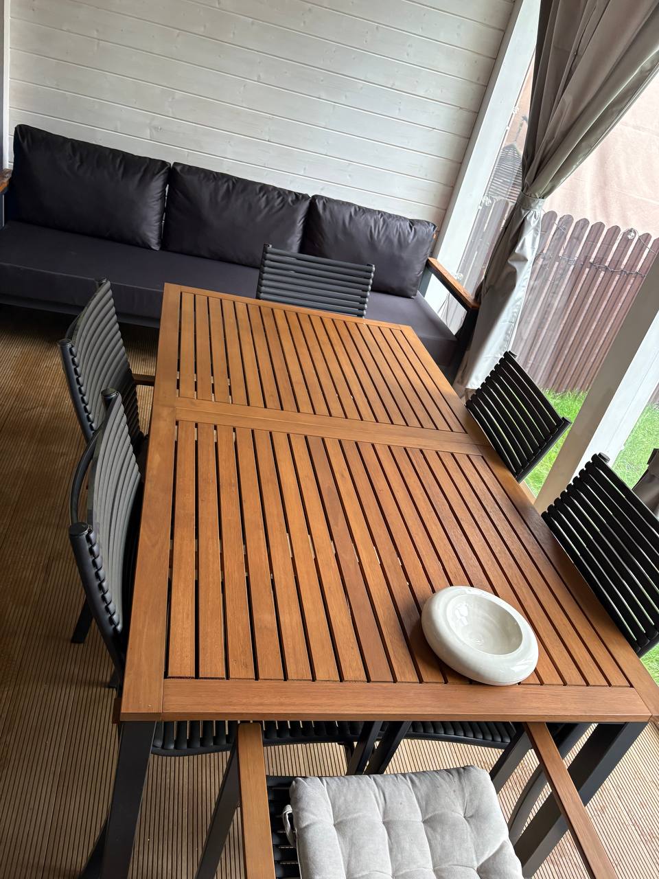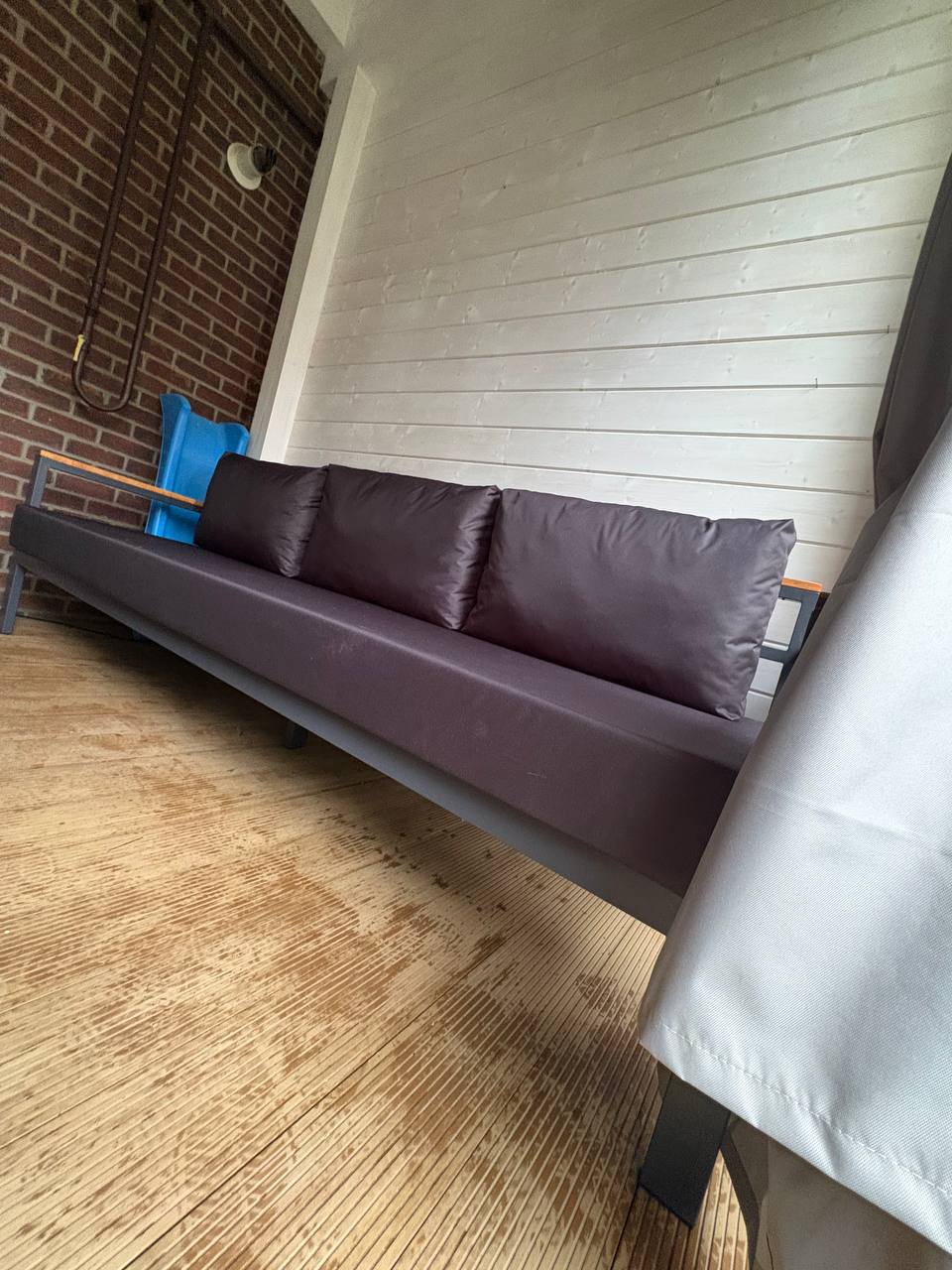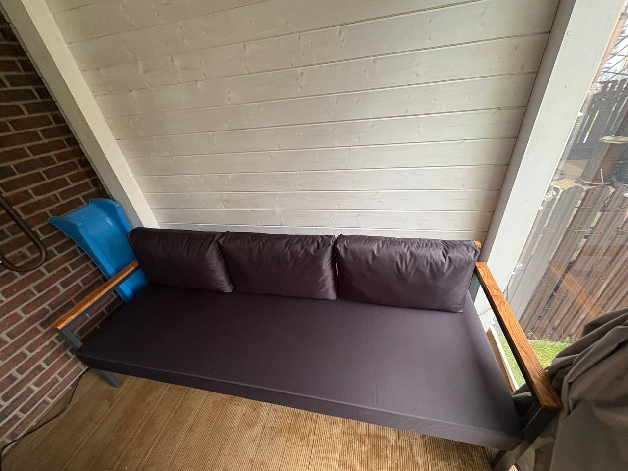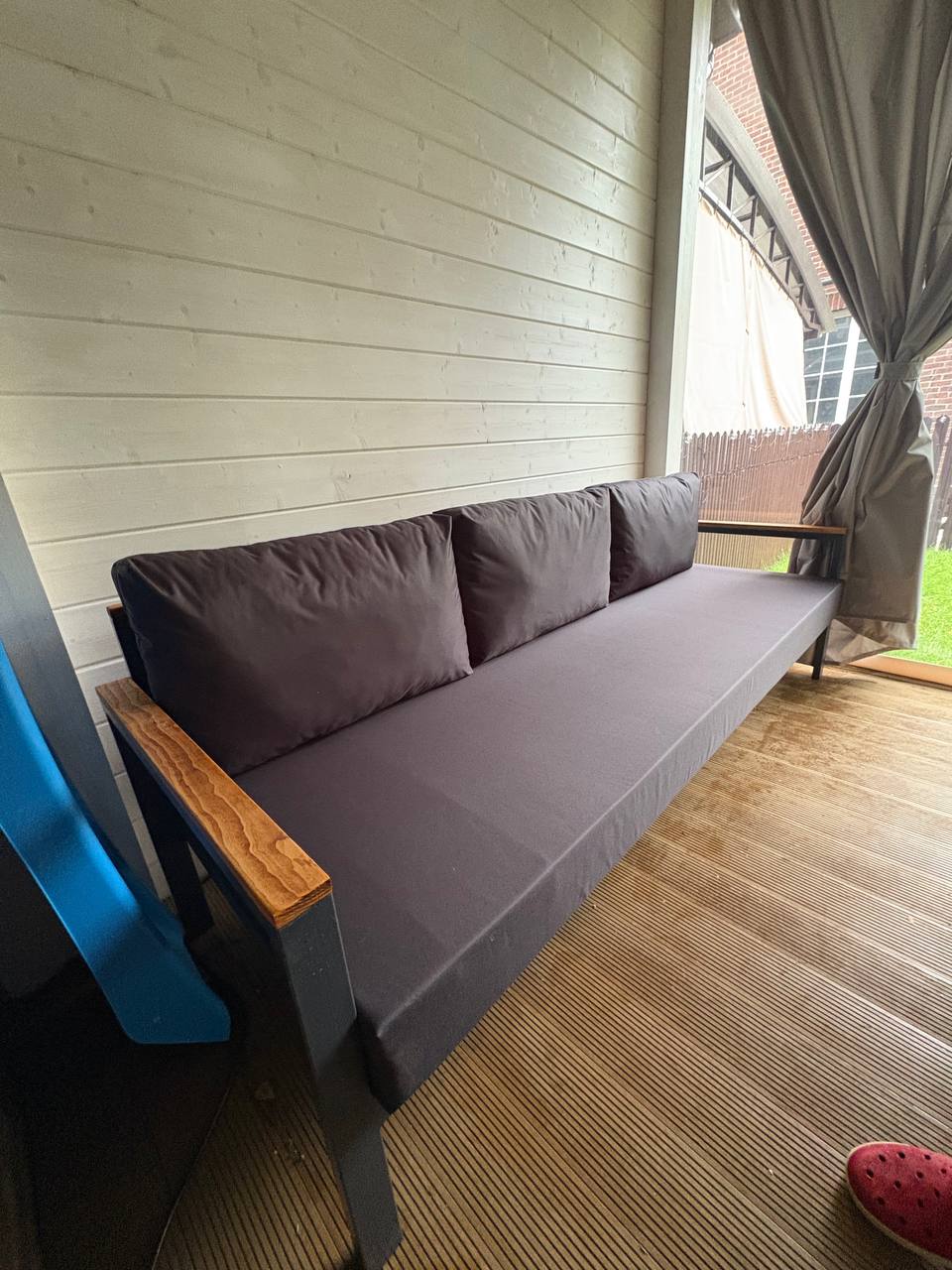 Металлический каркас с деревянными подлокотниками и мягкими уличными подушками. Подходит для открытых пространств.