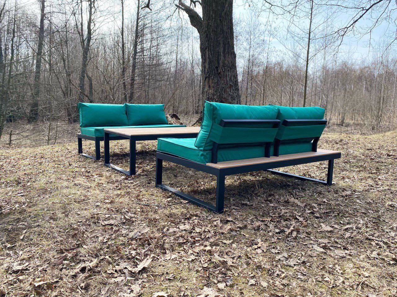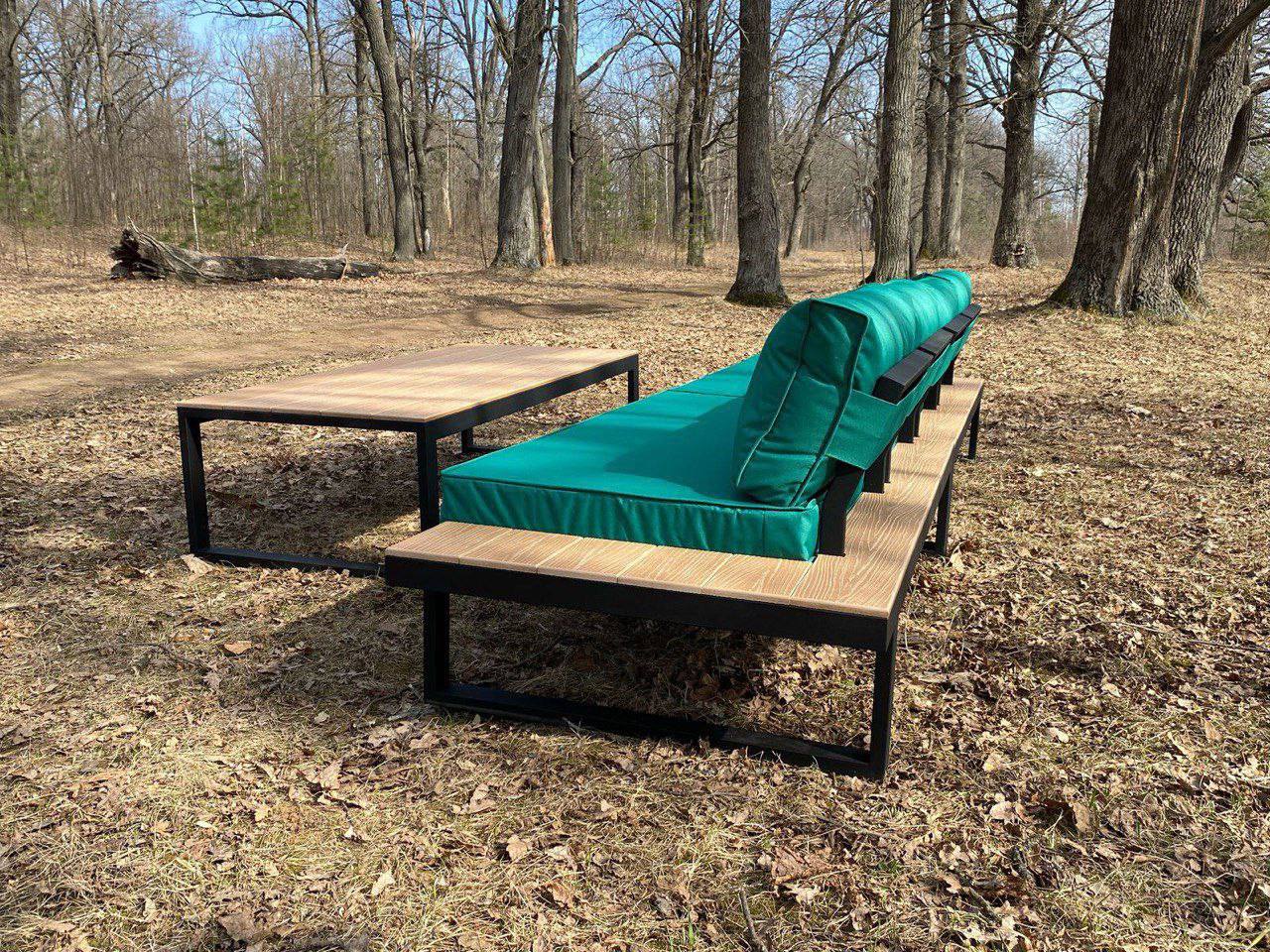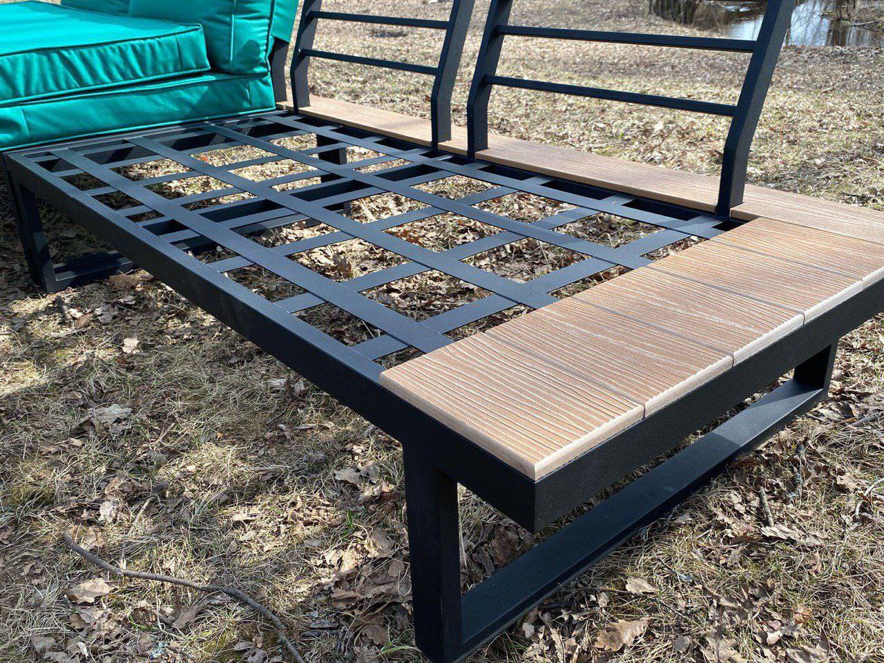 Металлический каркас с деревянными накладками, мягкие съемные подушки, открытая низкая посадка. Подходит для террас и зон отдыха.