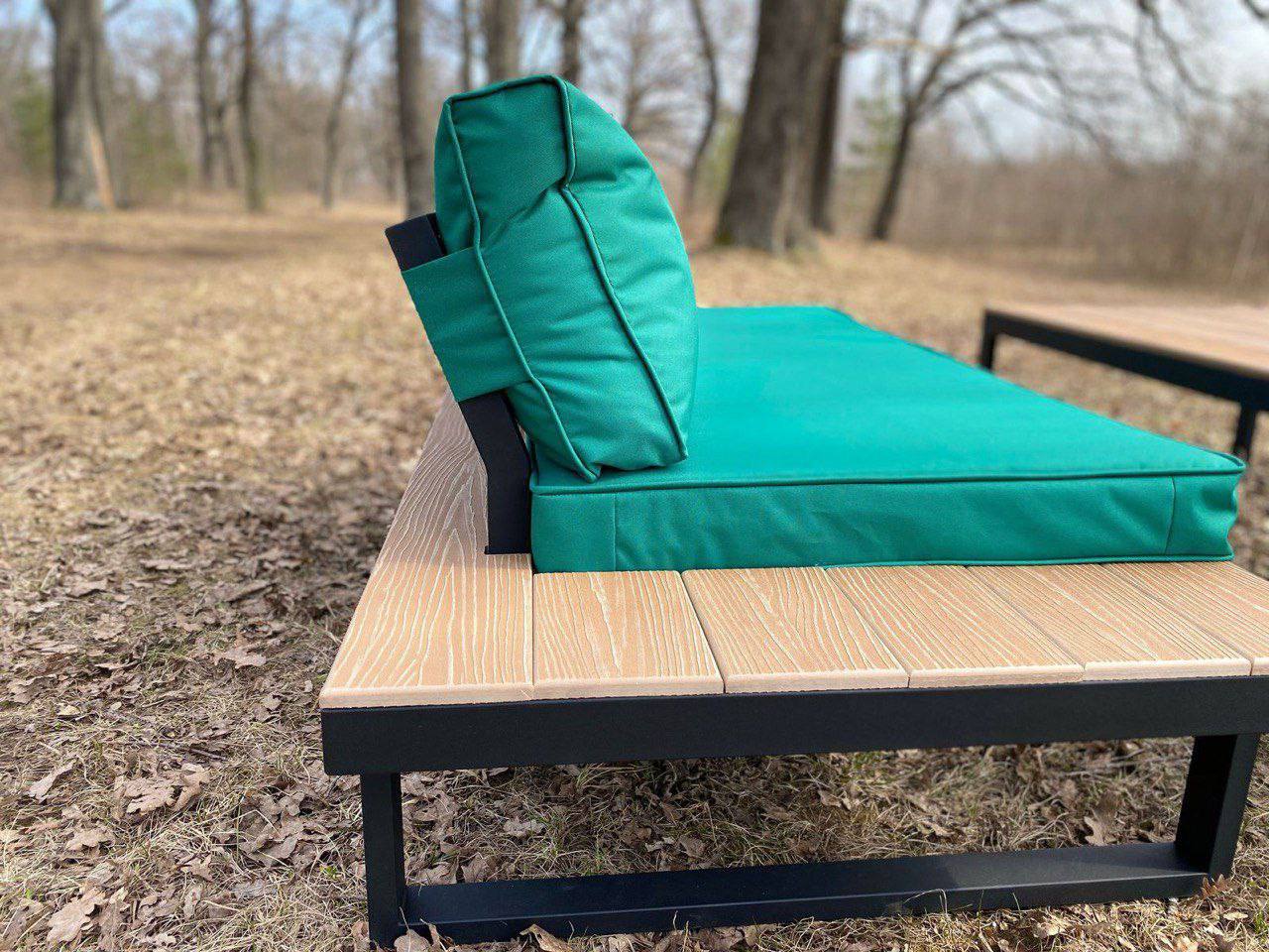 металл, дерево, уличная ткань; каркас черный, дерево светлое, подушки зеленые; размеры по проекту.