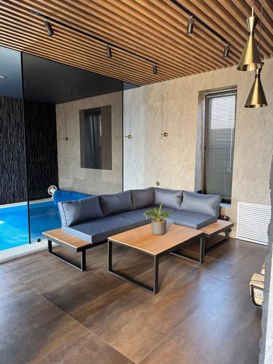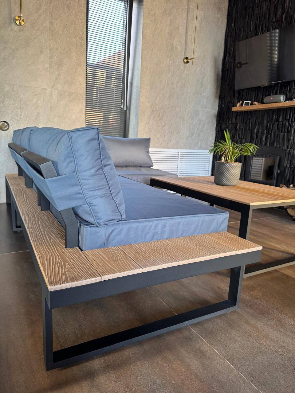 Металлический каркас с деревянными полками, мягкие съемные подушки и низкий стол. Подходит для общих зон отдыха.