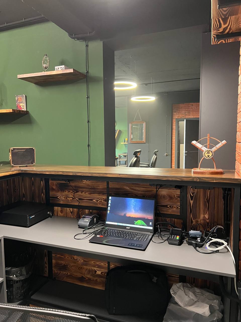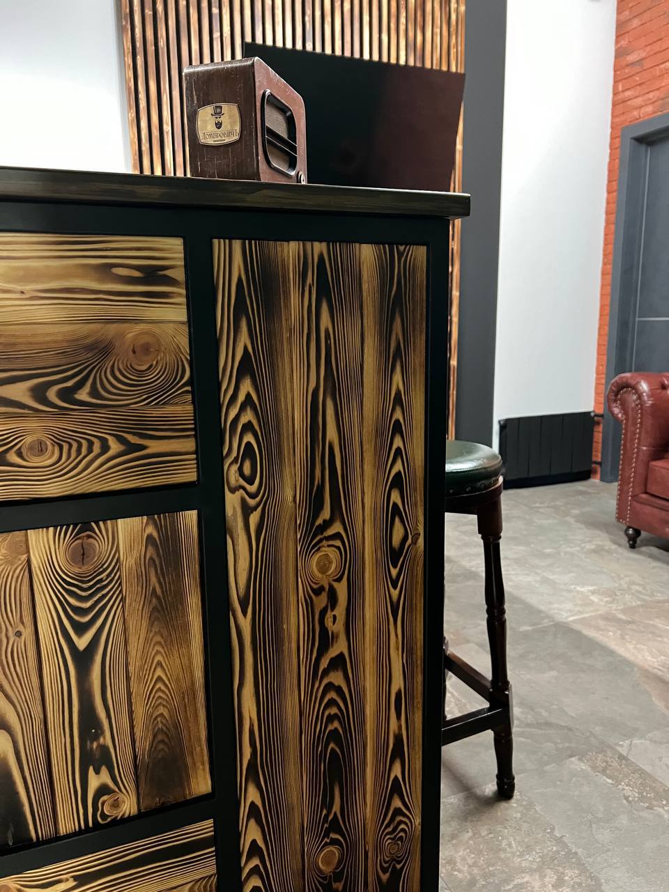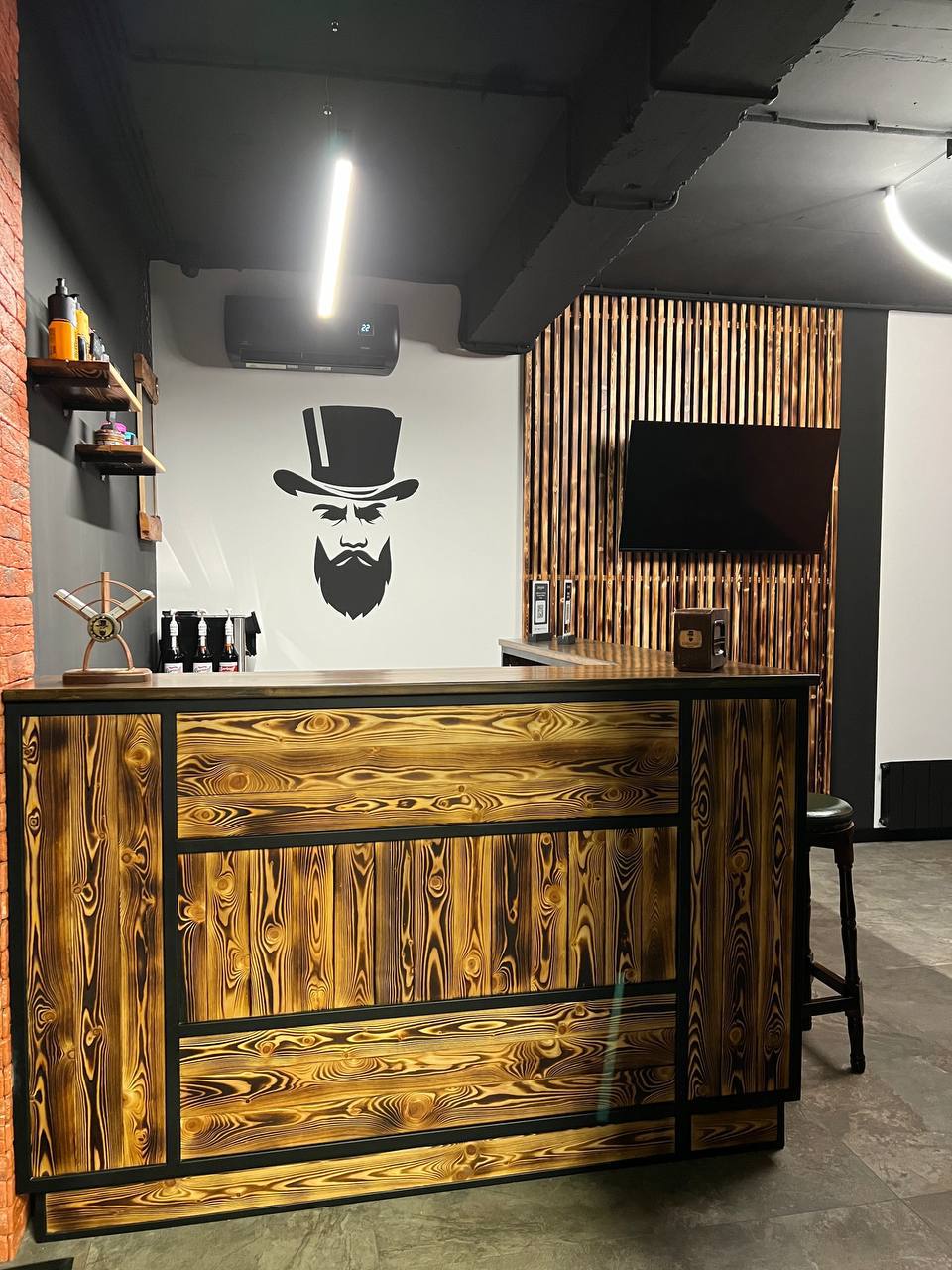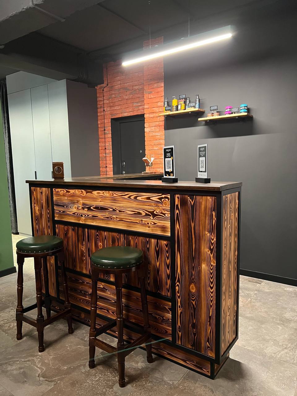 Металлический каркас с обжиговой доской, столешница и открытые полки. Интерьерное решение для барбершопов.