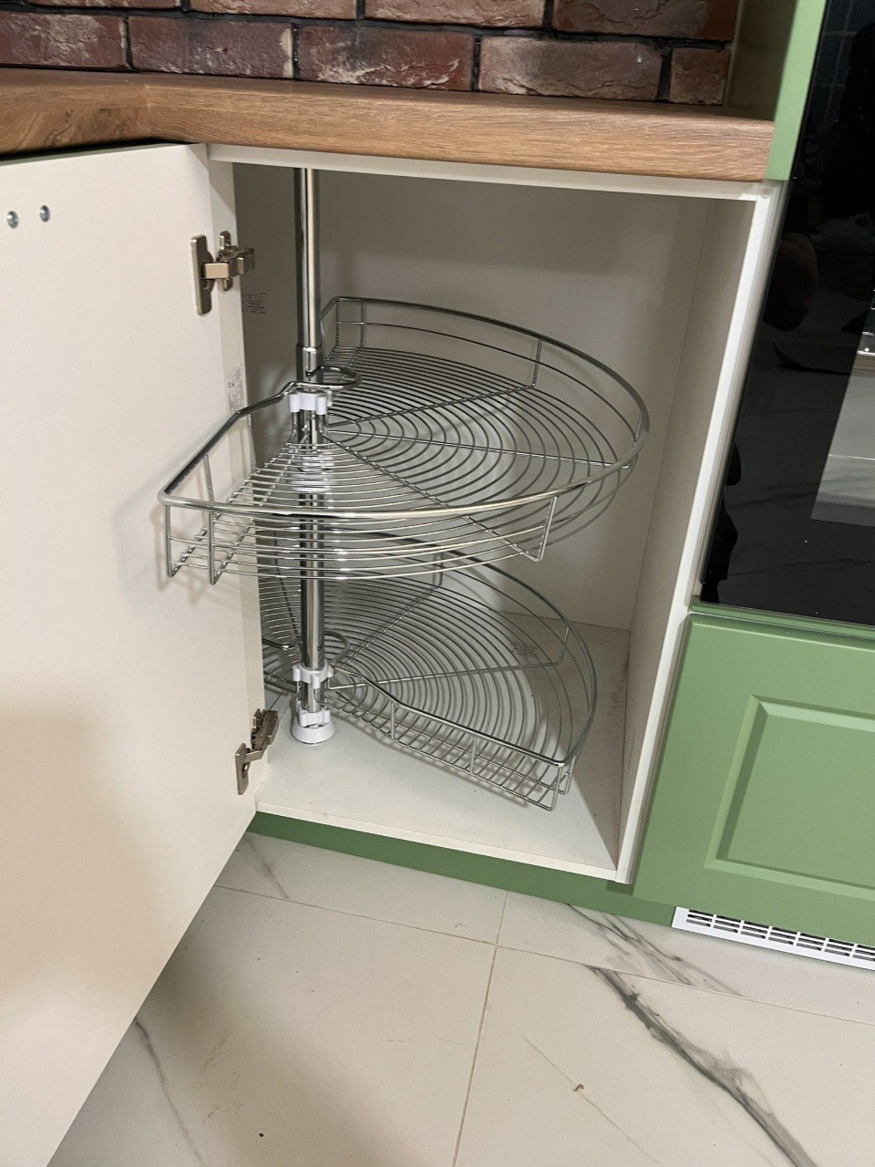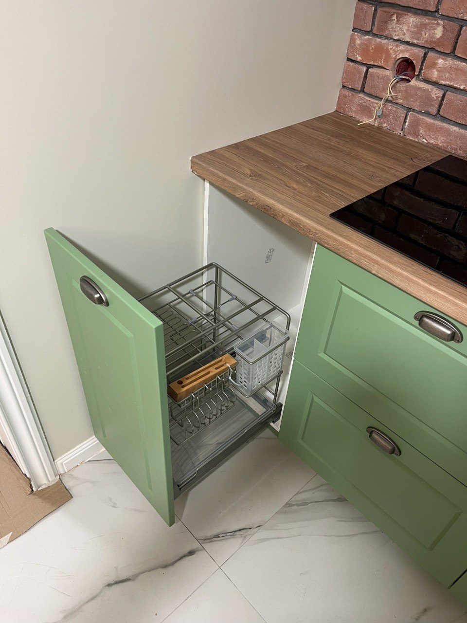 Каркас выполнен из металла, отделка подбирается под интерьер. Соберем конфигурацию под помещение и подберем фасады, фурнитуру и столешницу.