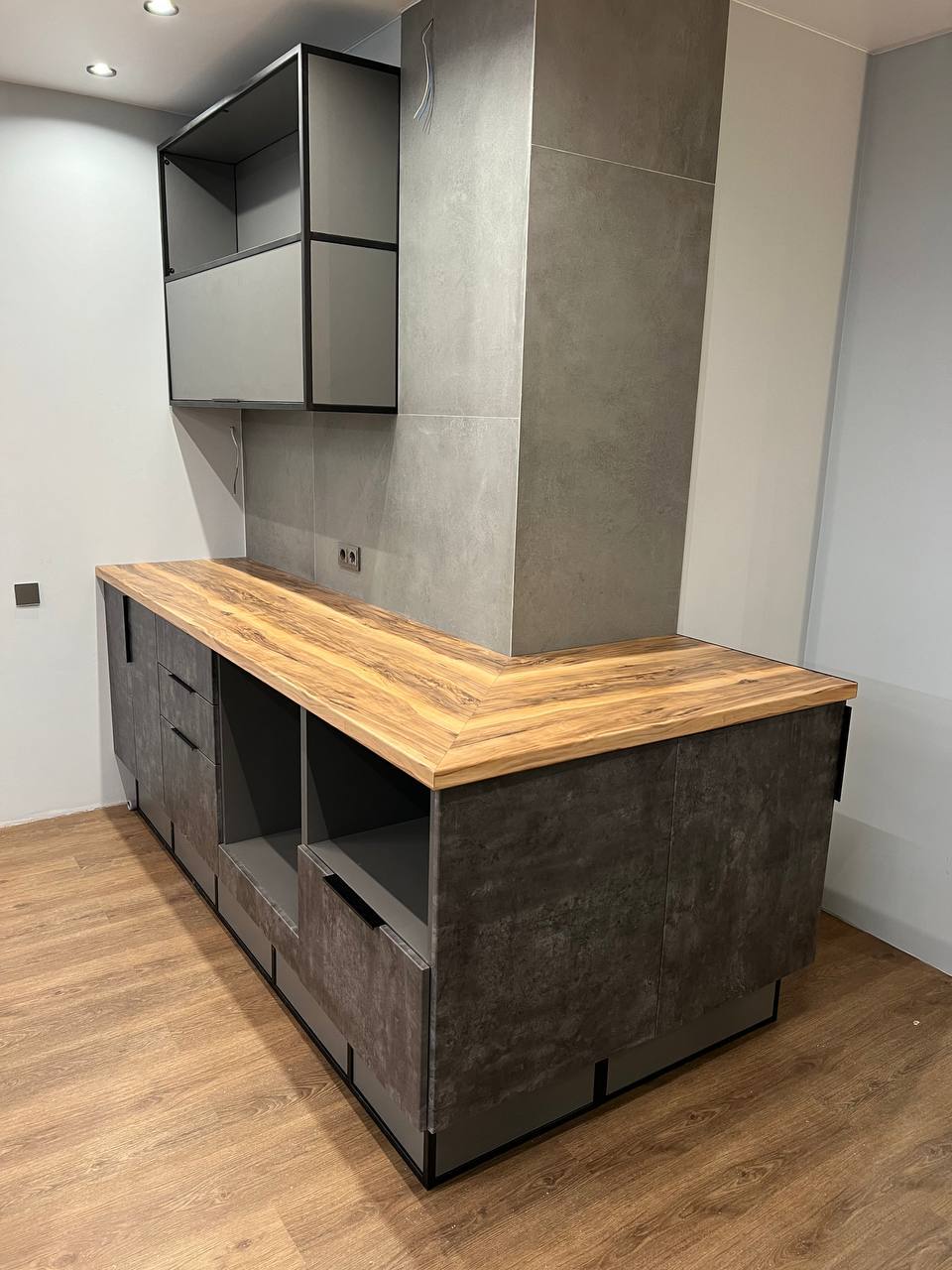 Каркас выполнен из металла, отделка подбирается под интерьер. Соберем конфигурацию под помещение и подберем фасады, фурнитуру и столешницу.
