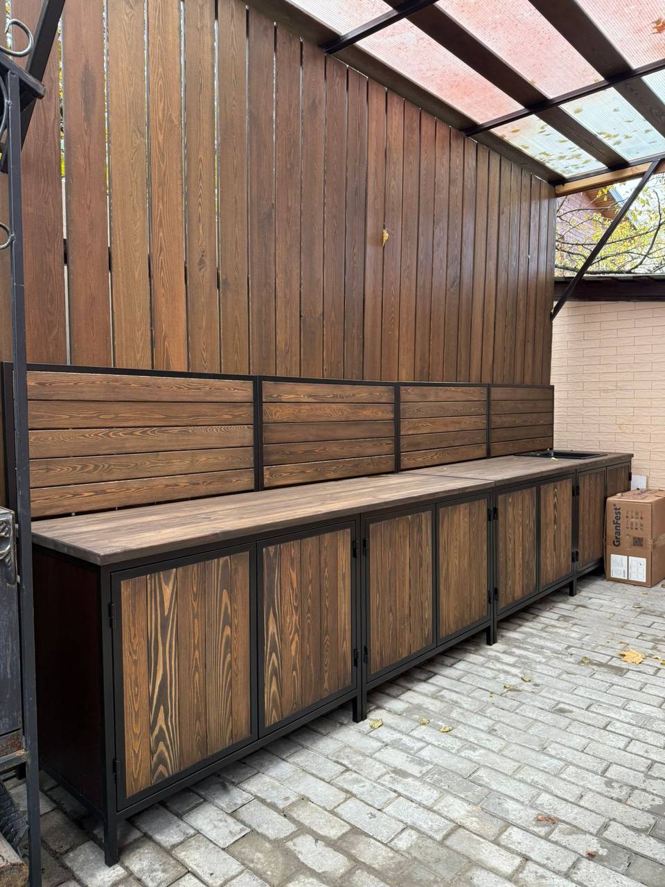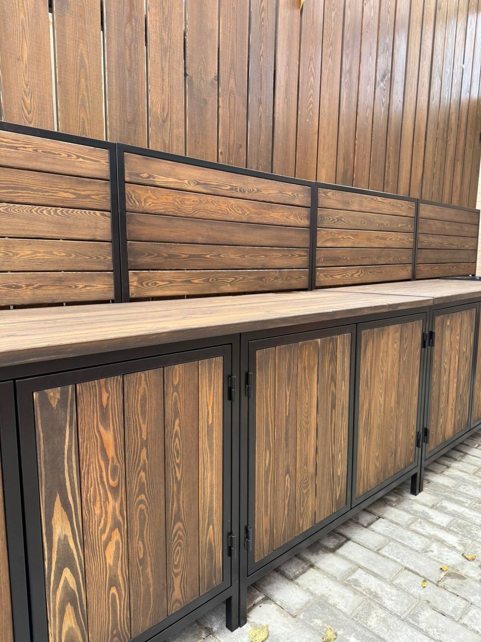 Каркас выполнен из стального профиля, окраска — порошковая для уличной эксплуатации. Соберем конфигурацию под помещение и подберем фасады, фурнитуру и столешницу.
