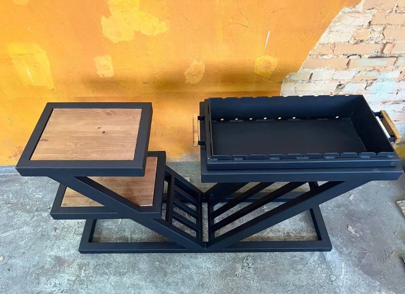 Каркас выполнен из стального профиля, окраска — порошковая для уличной эксплуатации. Деревянные элементы тонируются и защищаются под условия эксплуатации.