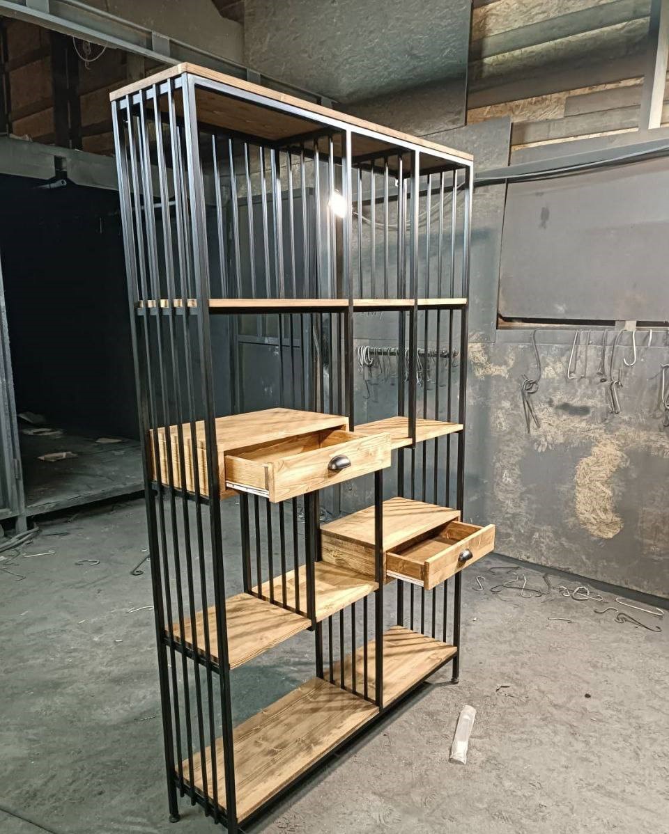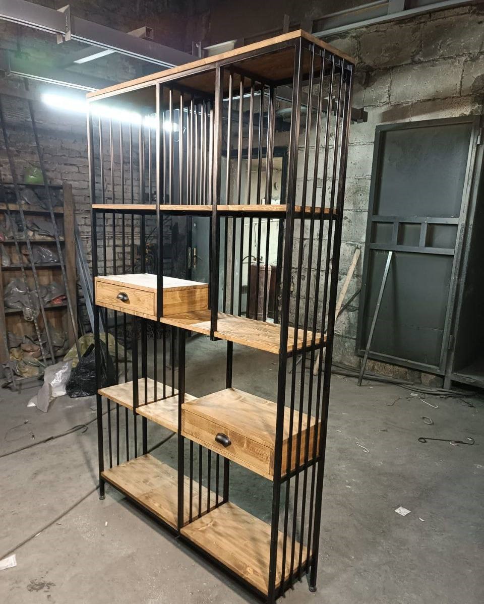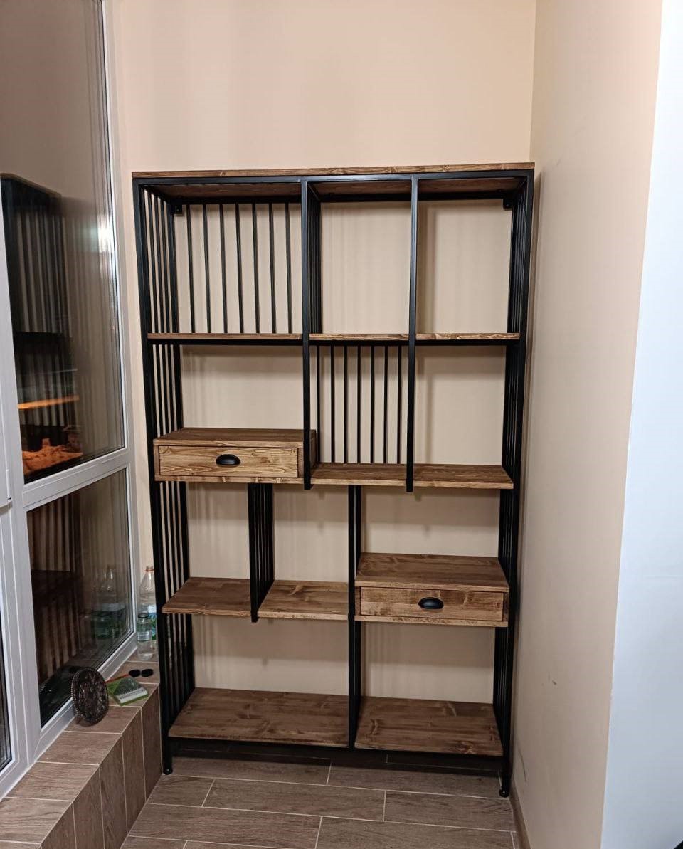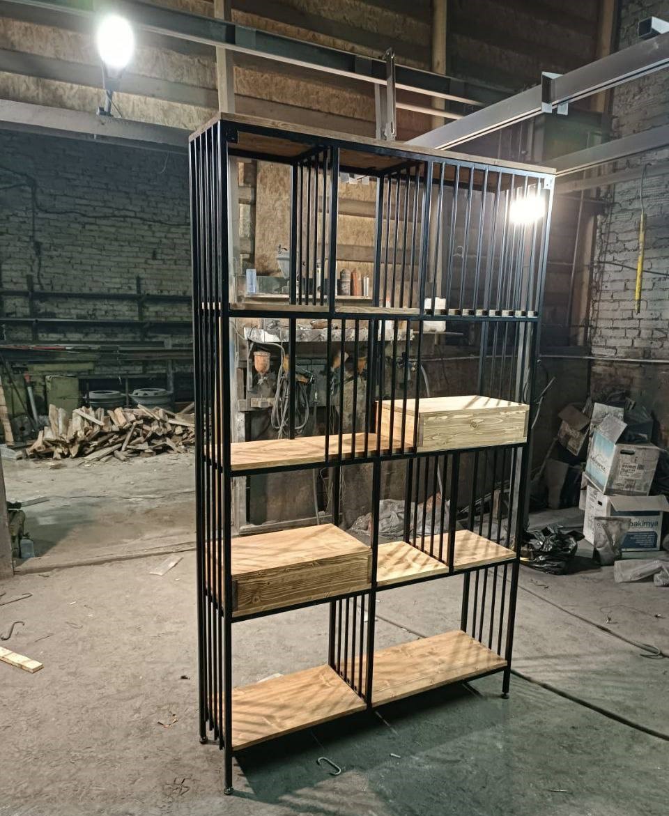 Каркас выполнен из металла, отделка подбирается под интерьер. Возможны варианты фасадов, внутреннего наполнения и подсветки.