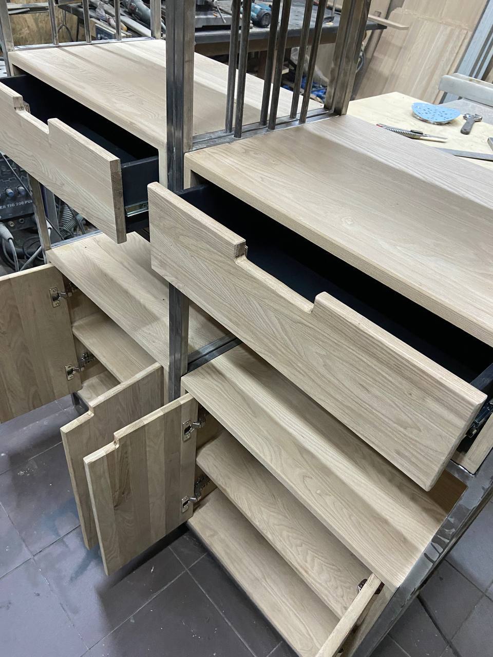 Каркас выполнен из металла, отделка подбирается под интерьер. Возможны варианты фасадов, внутреннего наполнения и подсветки.