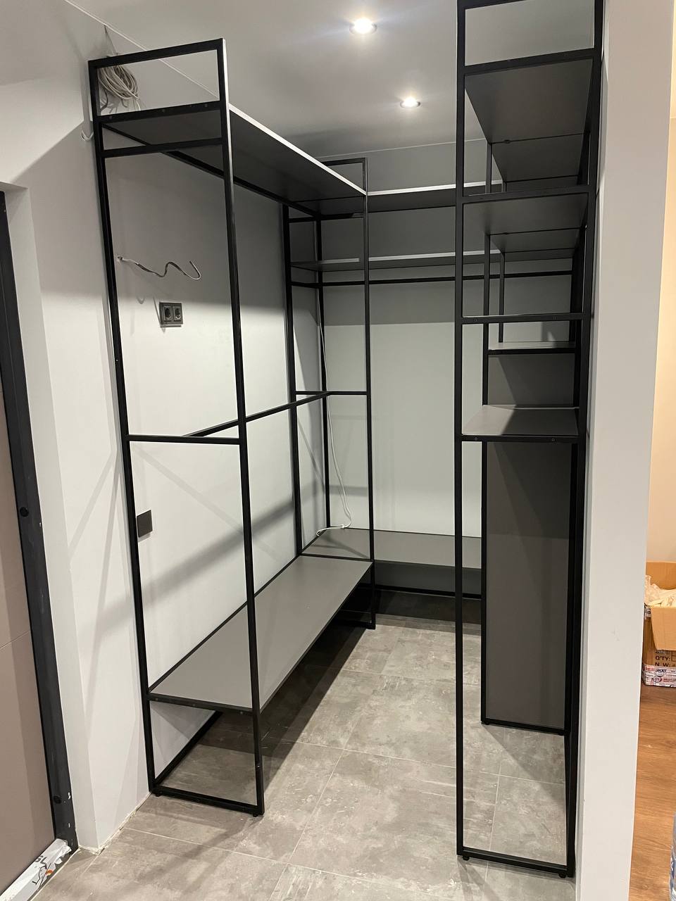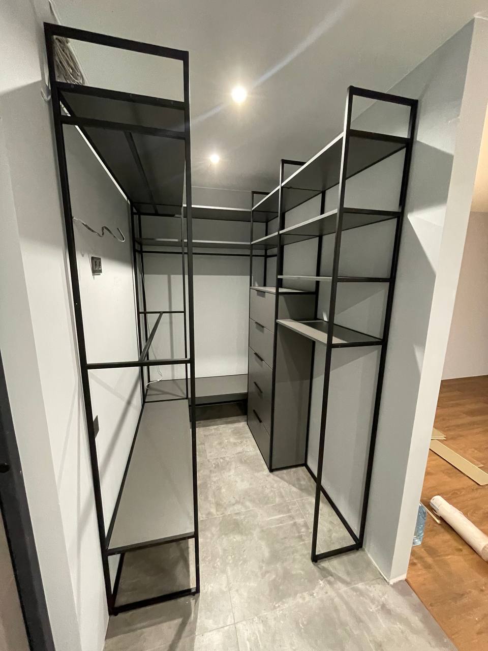 Каркас из металла, полки и стойки для одежды, модуль с ящиками. Подходит для гардеробных комнат и ниш.