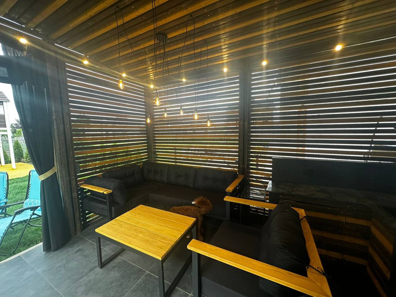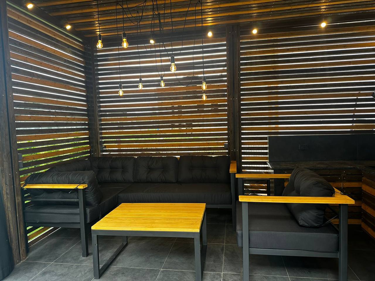 Каркас выполнен из стального профиля, окраска — порошковая для уличной эксплуатации. Размеры и комплектацию согласуем под вашу террасу или участок.