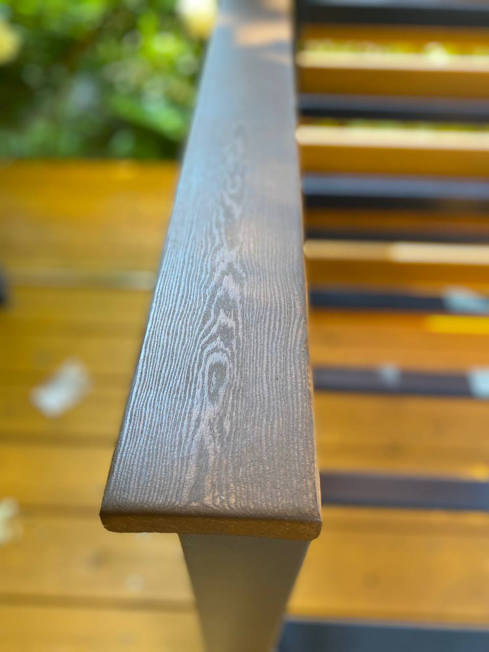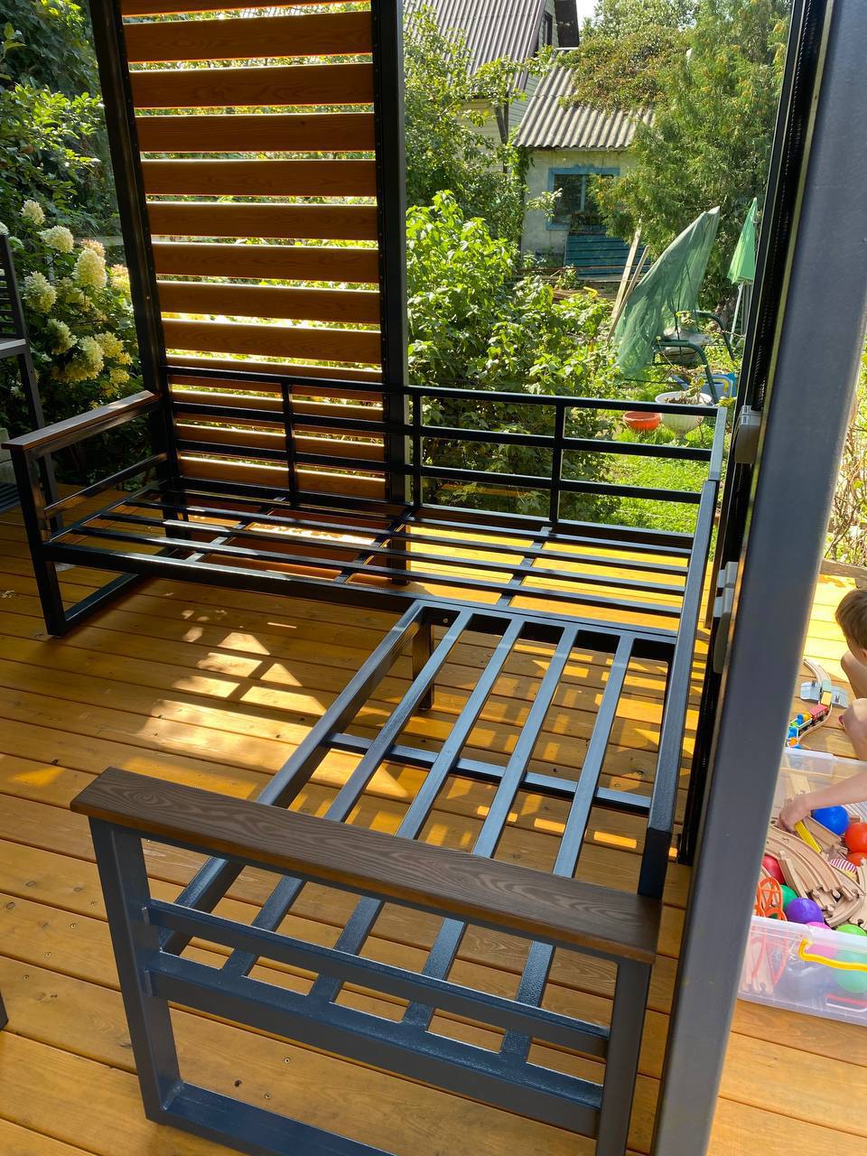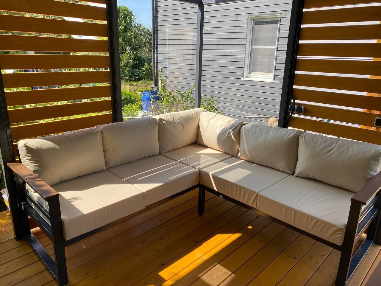 Металлический каркас с деревянными подлокотниками, глубокая посадка и мягкие съемные подушки. Подходит для беседок и веранд.