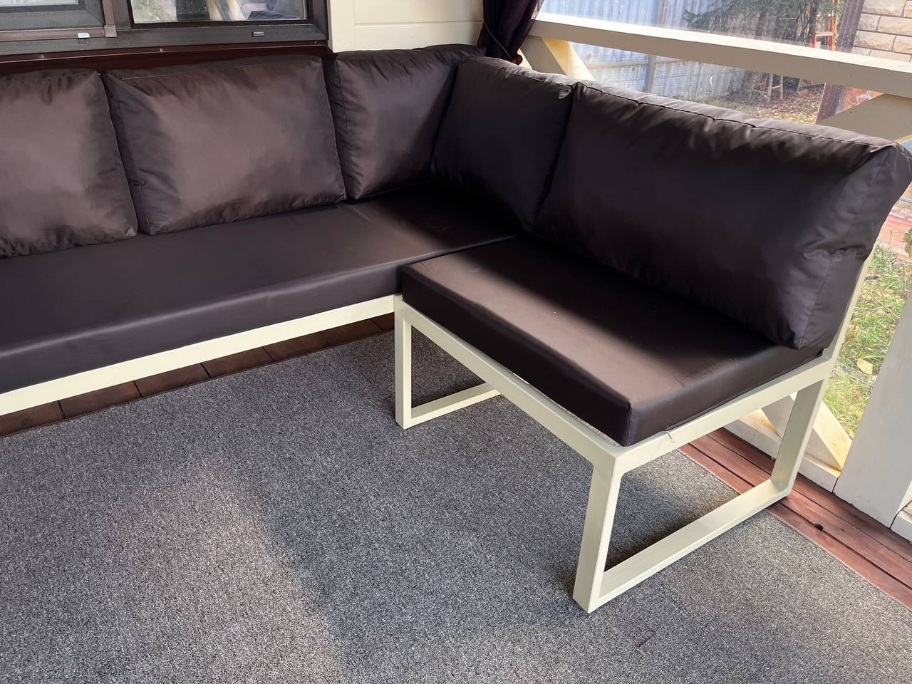 металл, массив дерева, уличная ткань; каркас светлый, подушки темно-серые; размеры по проекту.