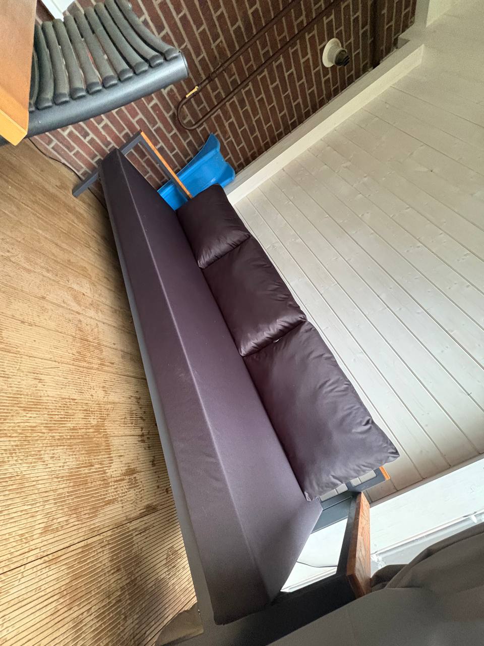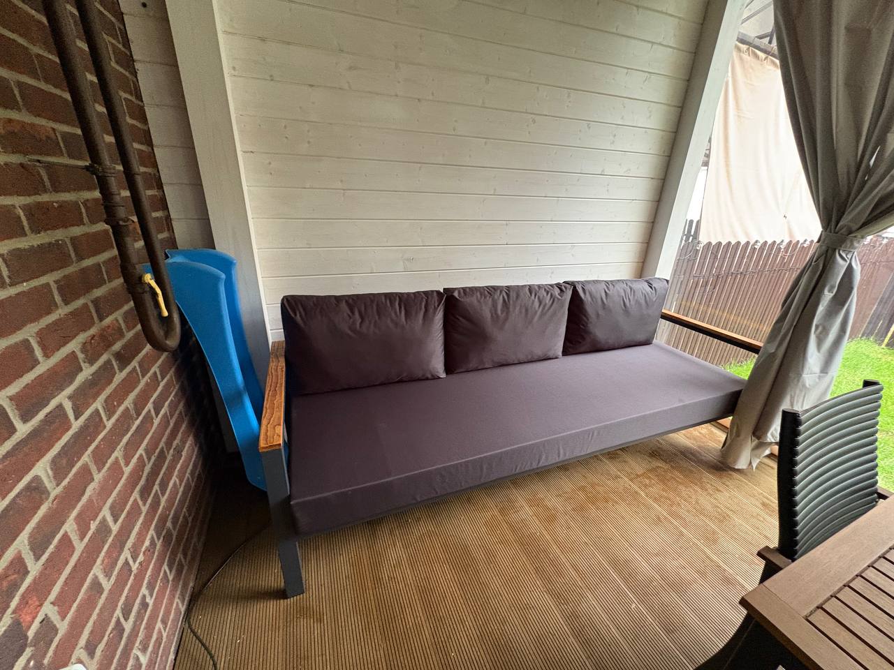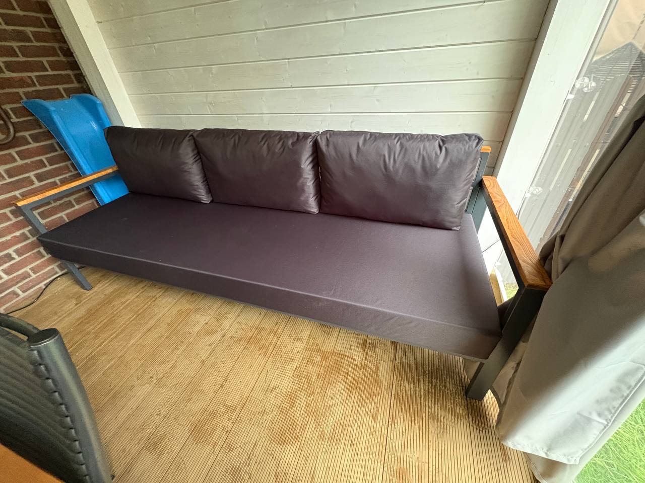 Металлический каркас с деревянными подлокотниками и мягкими уличными подушками. Подходит для открытых пространств.