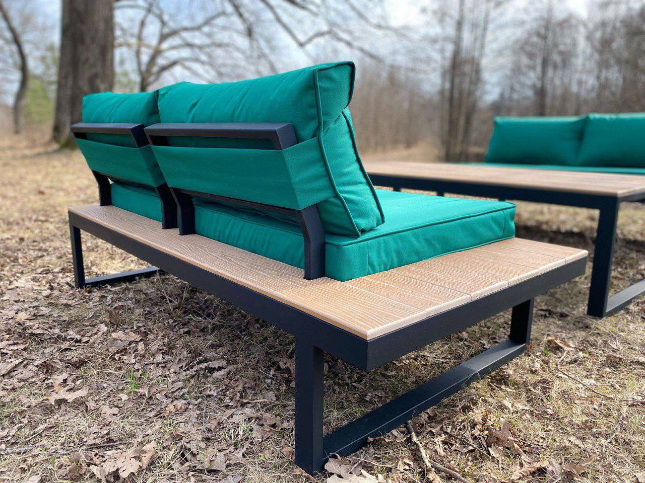 Металлический каркас с деревянными накладками, мягкие съемные подушки, открытая низкая посадка. Подходит для террас и зон отдыха.