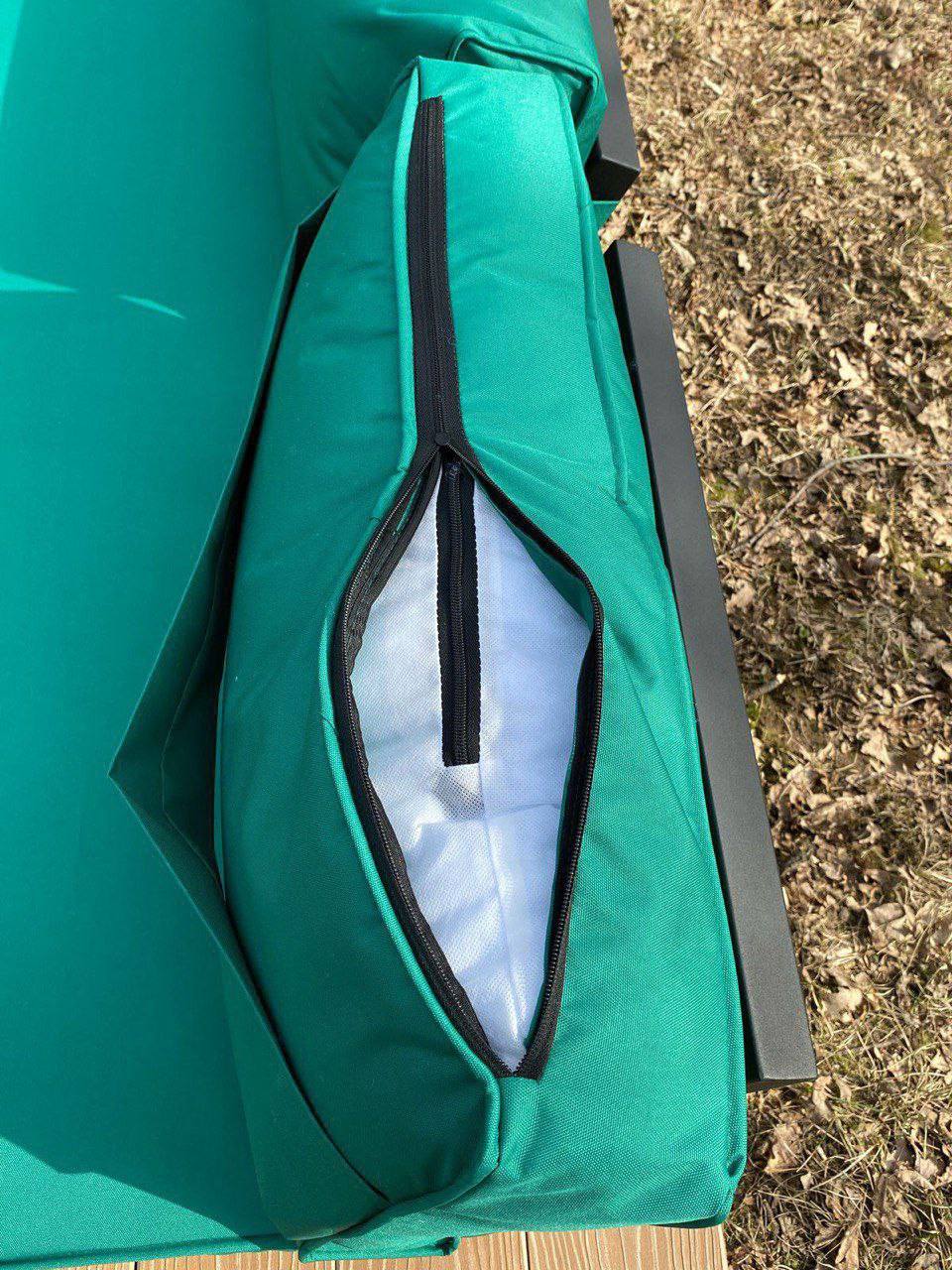 металл, дерево, уличная ткань; каркас черный, дерево светлое, подушки зеленые; размеры по проекту.