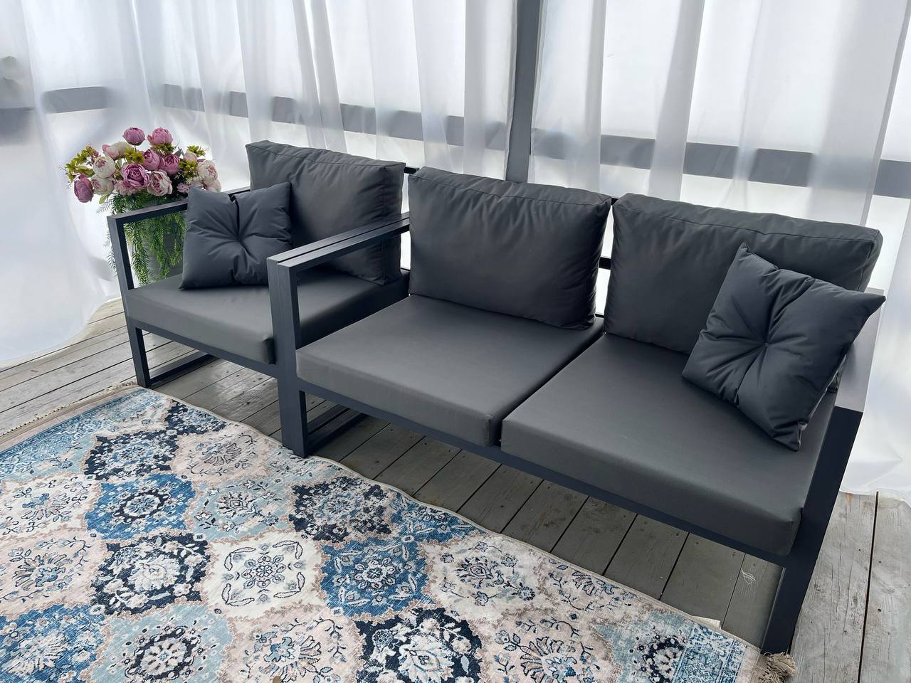 металл, уличная ткань; каркас темно-серый, подушки серые; размеры по проекту.